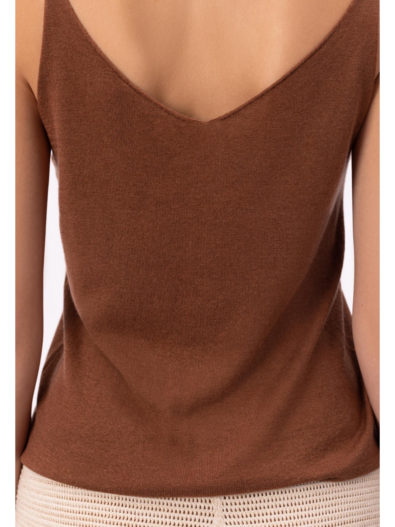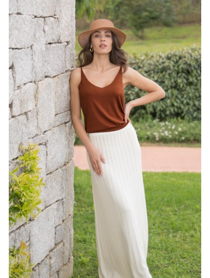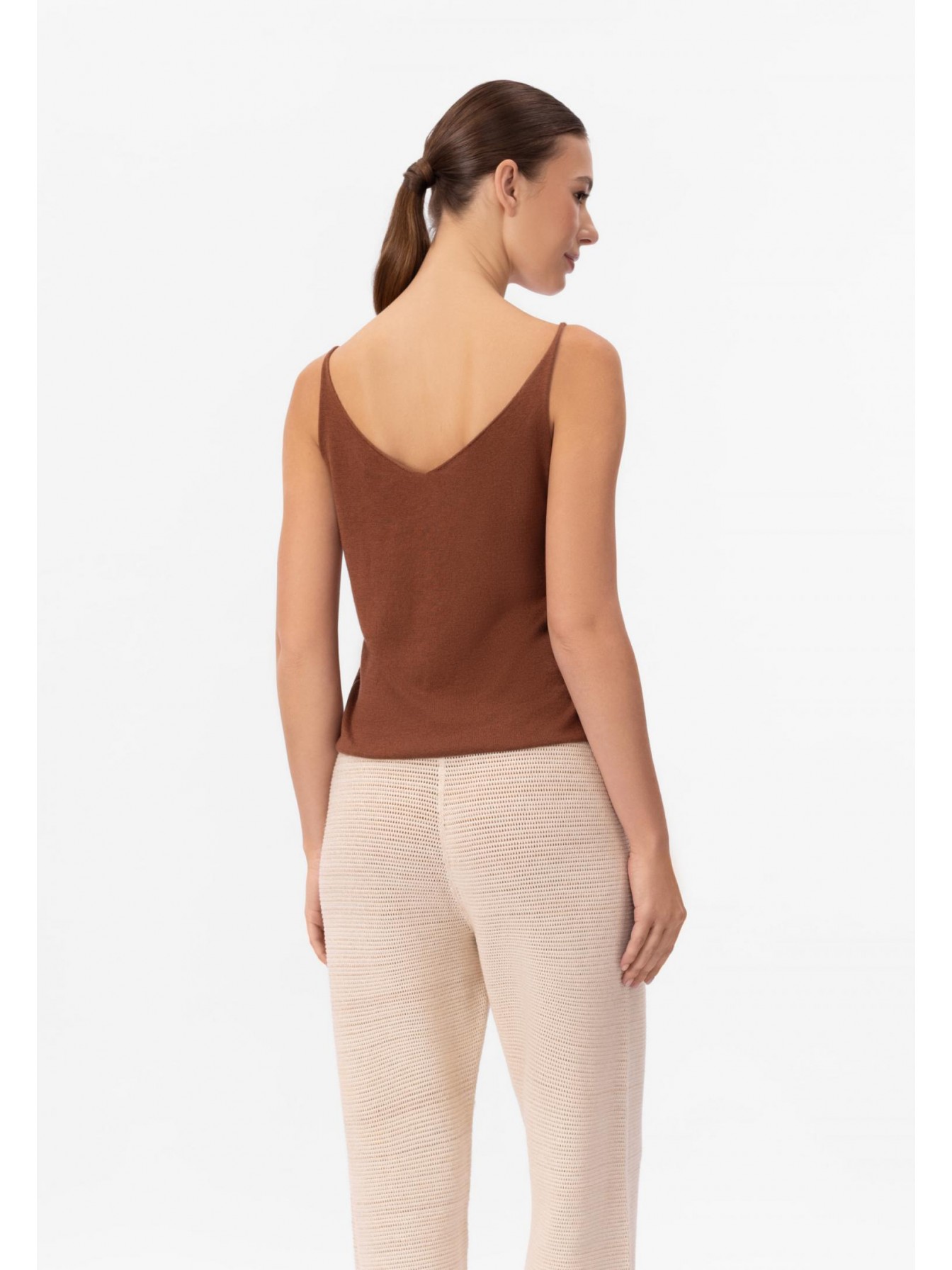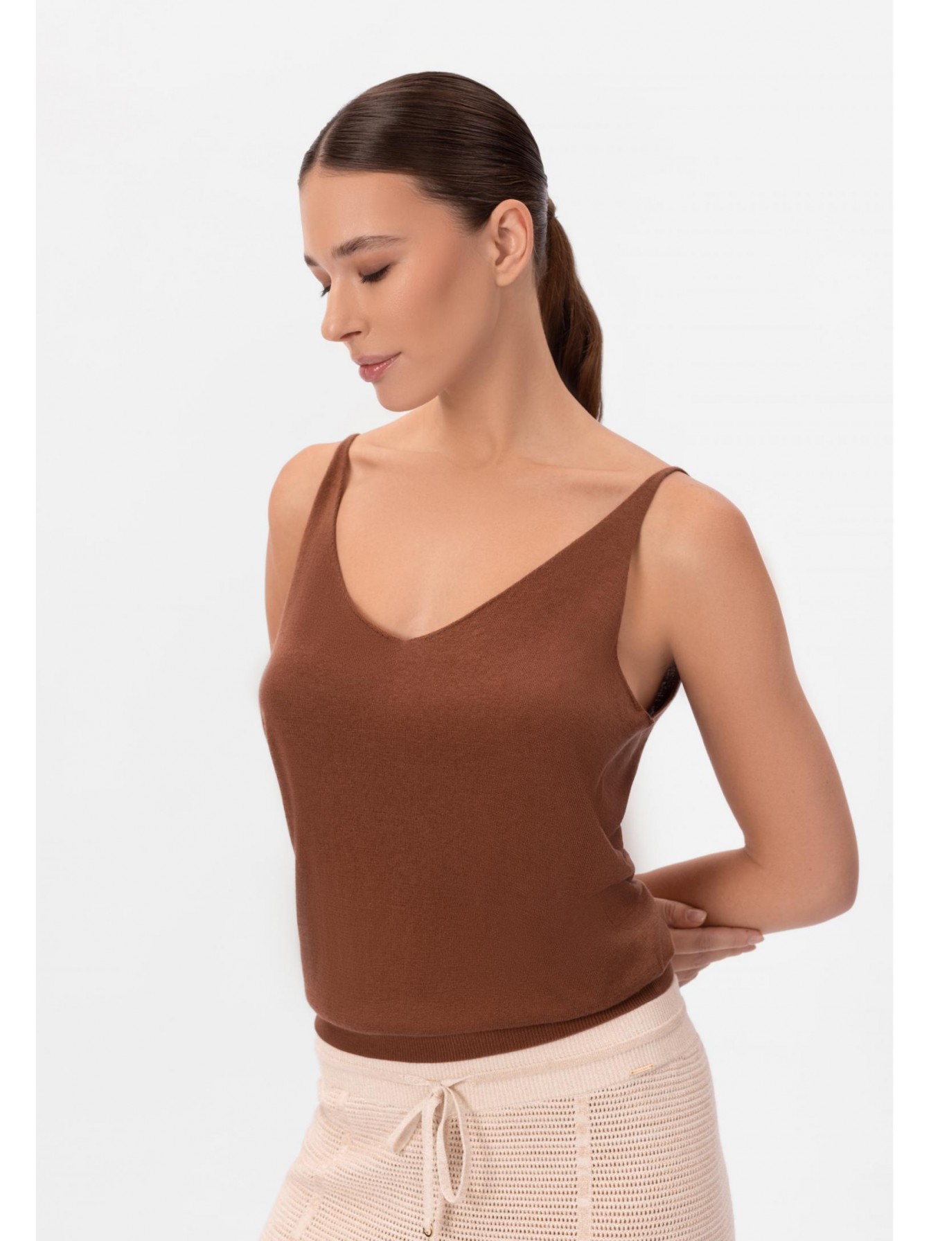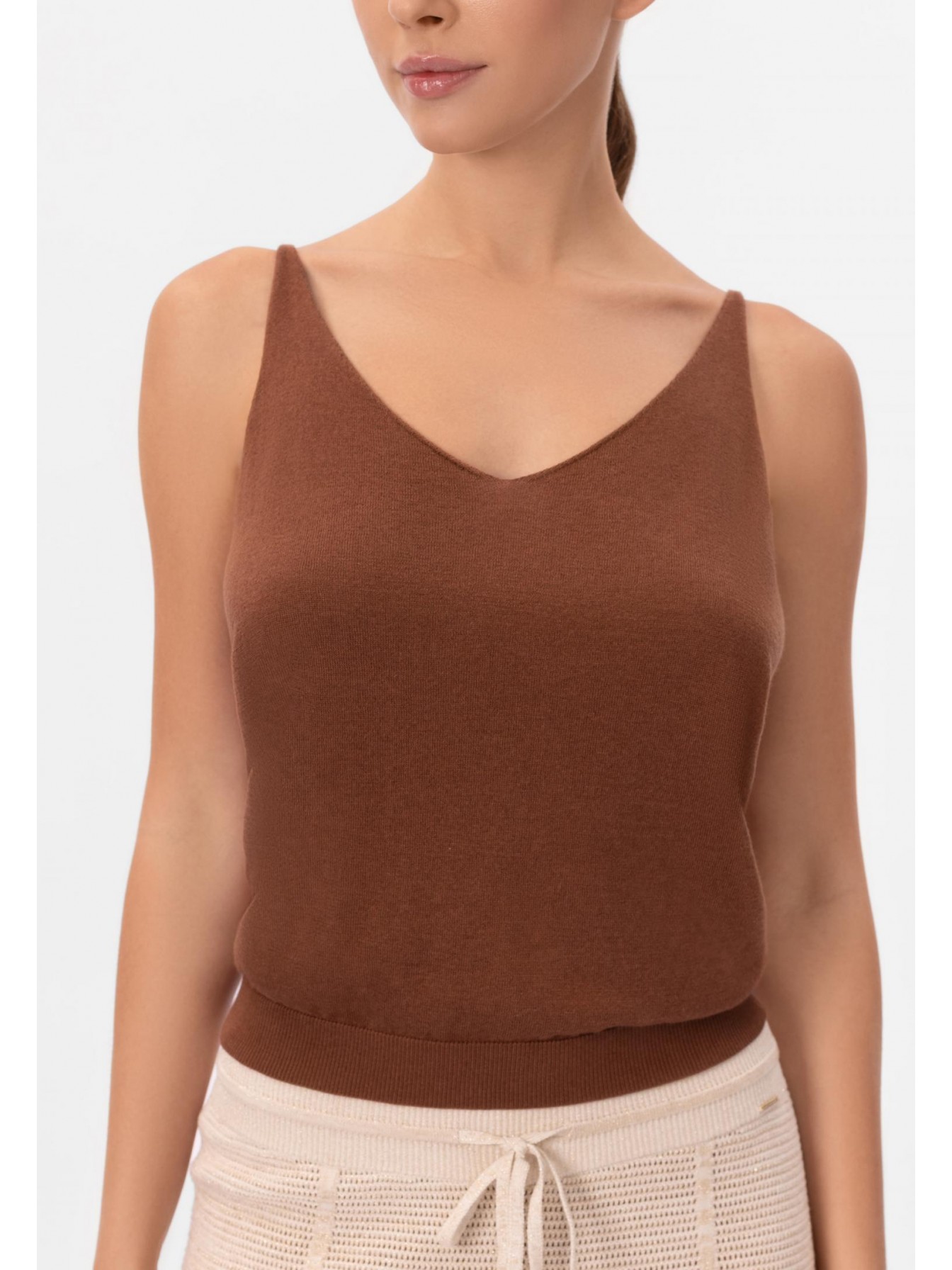 Легкий топ полуприлегающего силуэта на тонких бретелях. V-образный вырез. Эластичная вязаная резинка по нижнему краю. Смесовый материал из мягкого шелка и тонкого кашемира — идеальный вариант для создания роскошного летнего образа.