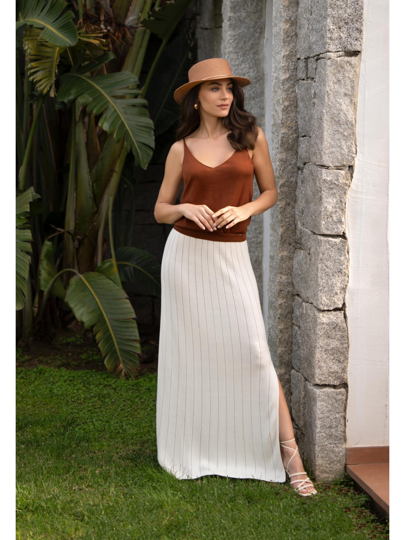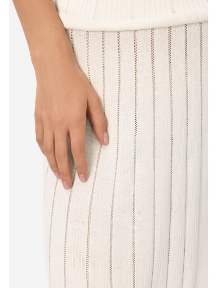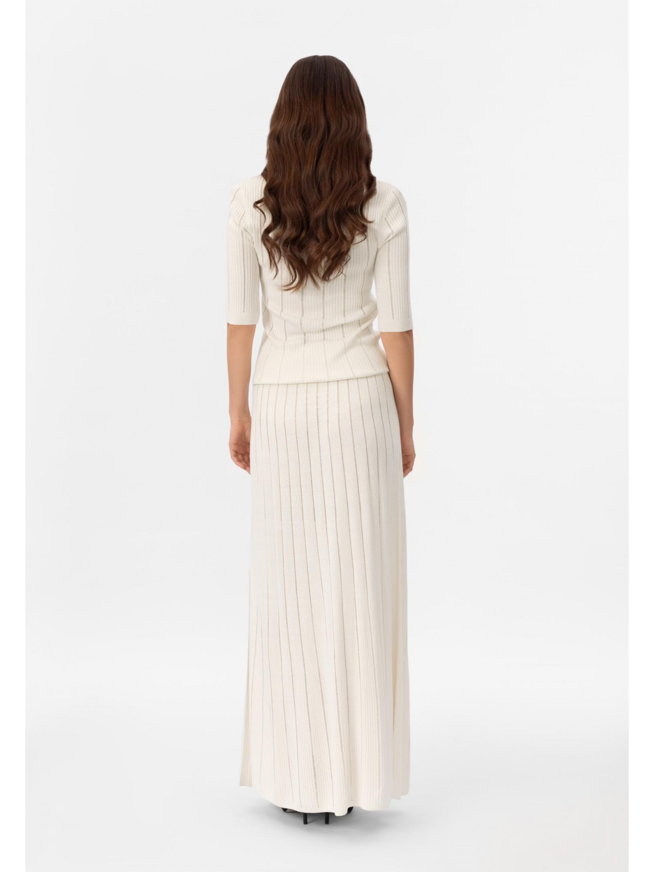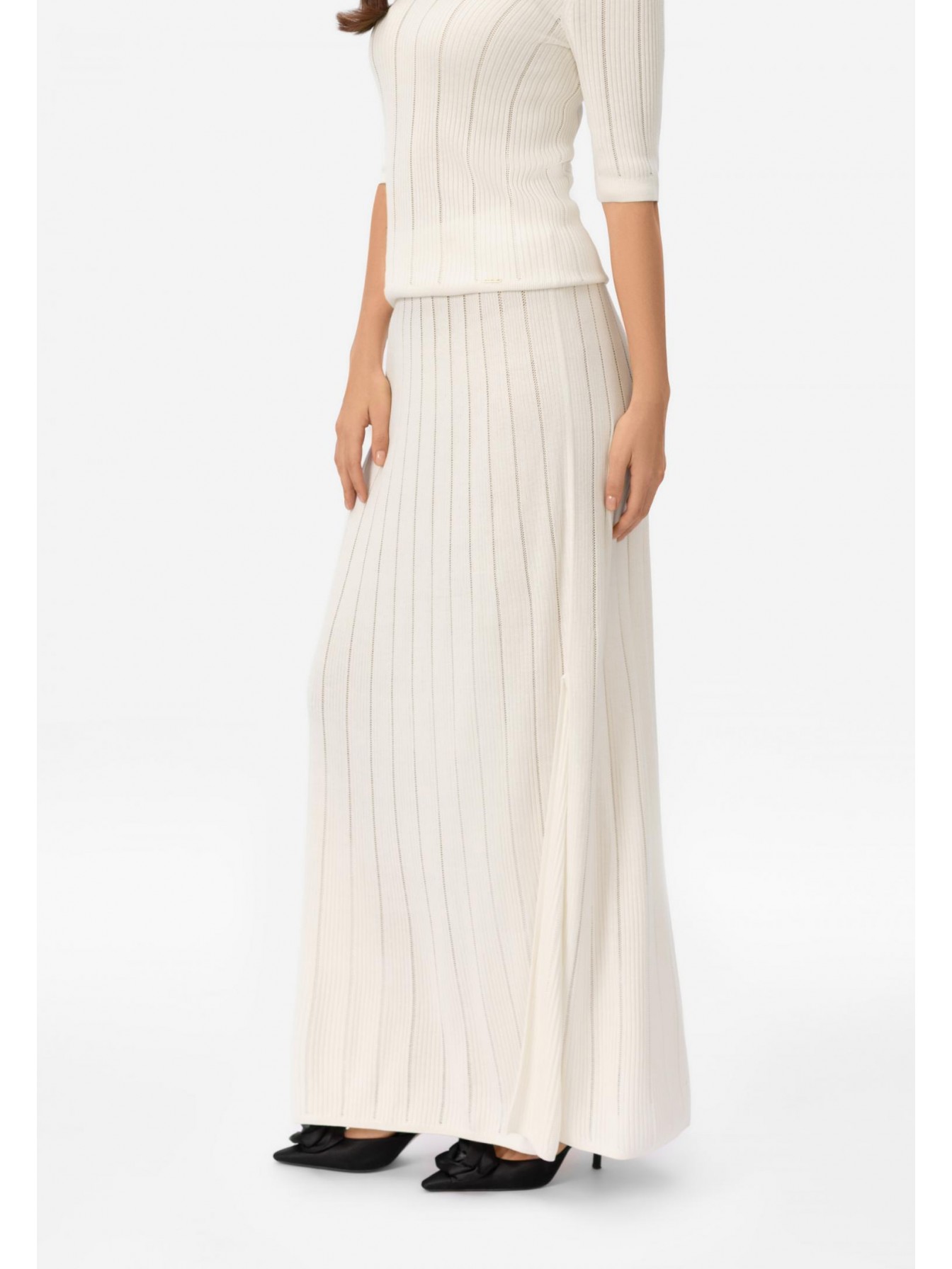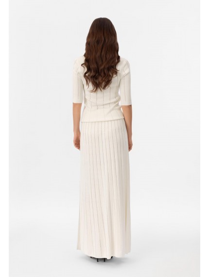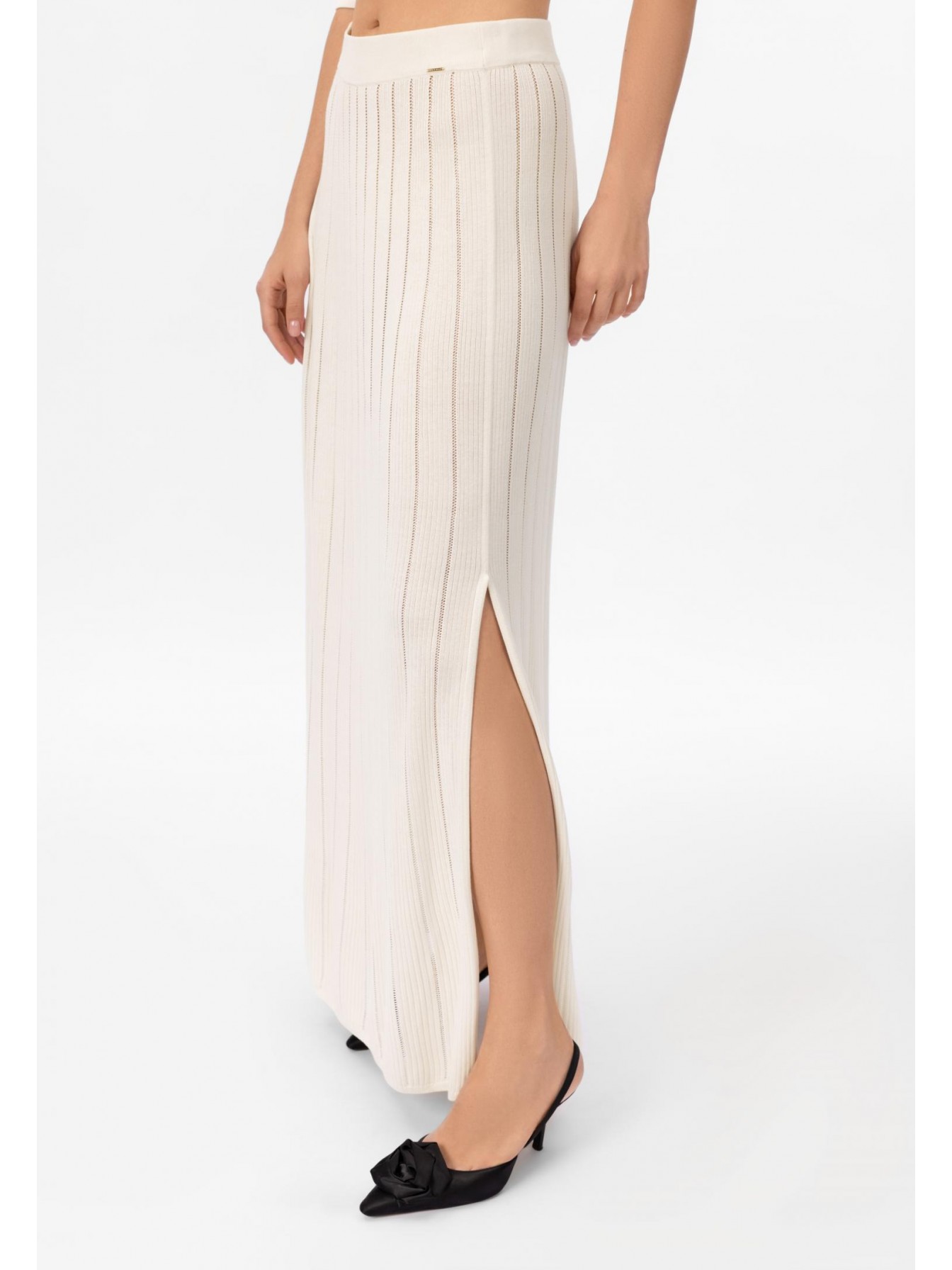Юбка-макси из шелка и вискозы. Эластичный пояс из вязанной резинки. Слева боковой разрез до колена. Изделие выполнено из трикотажа в рубчик с элементами «пуантель