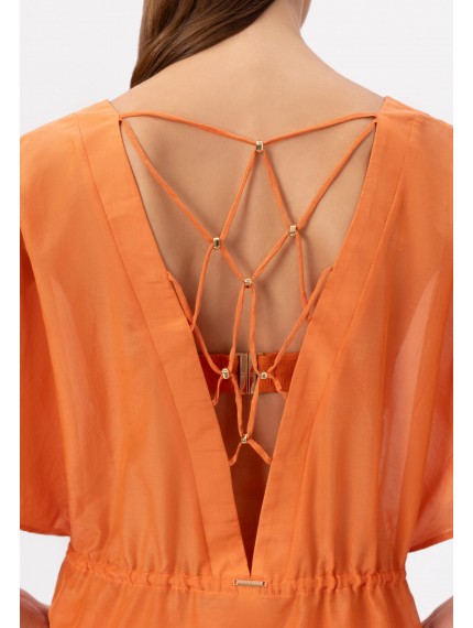 Туника свободного кроя из шелка и хлопка. Линия талии регулируется кулиской. Открытая спина. Фантазийная декоративная сетка из вытачного шнура и аксессуаров.
