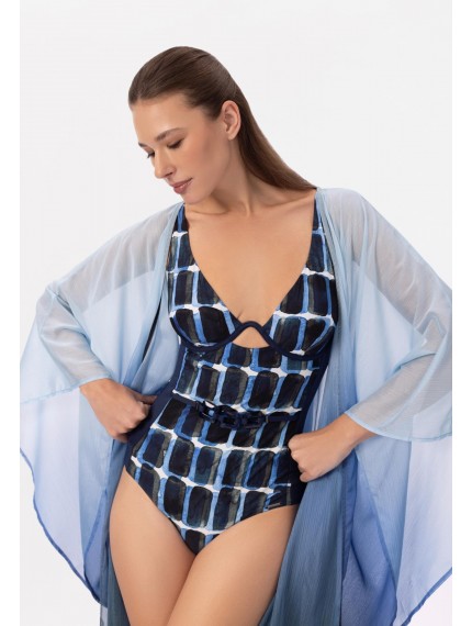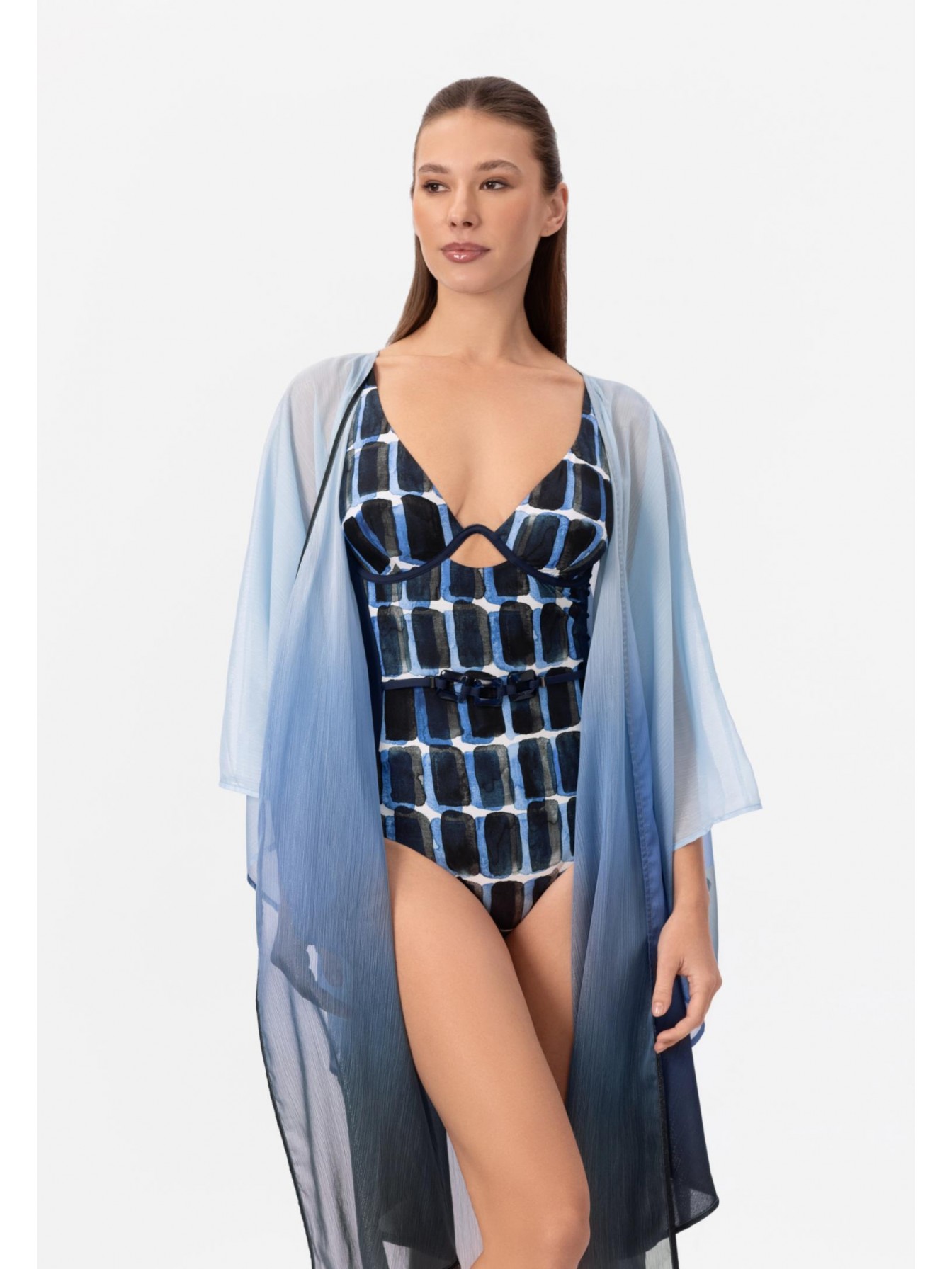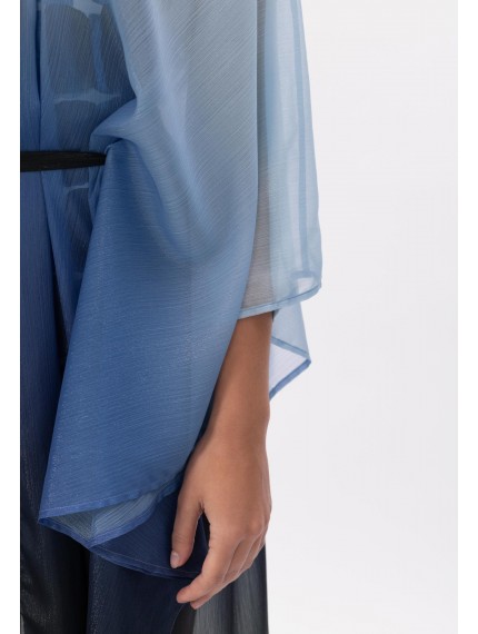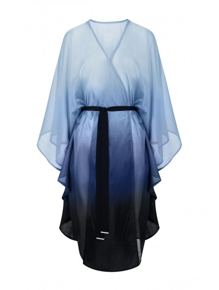 Туника свободного кроя с эффектом омбре, длина до уровня колен. V-образный вырез горловины. Рукава напоминают крылья бабочки. Съемный пояс. «Placement» принт.
