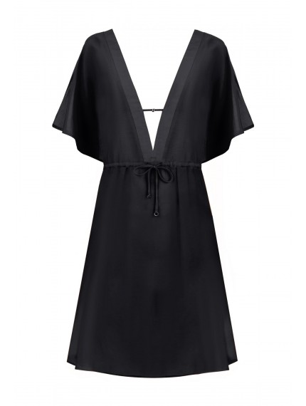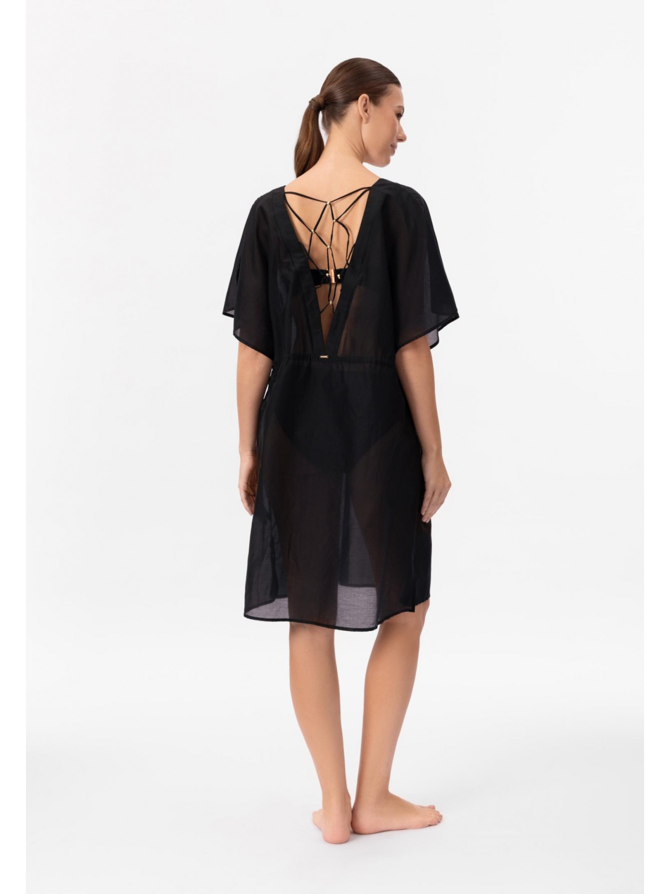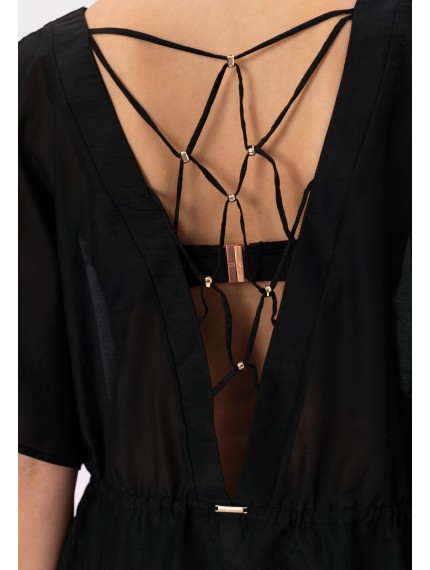 Туника свободного кроя из шелка и хлопка. Линия талии регулируется кулиской. Открытая спина. Фантазийная декоративная сетка из вытачного шнура и аксессуаров.