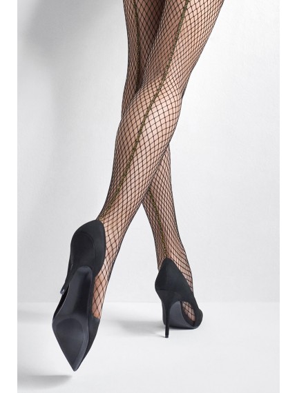 Колготки в сеточку Charly R15 с декоративными золотыми швами сзади. Небольшая ластовица, удобный эластичный пояс и невидимое усиление мыска.