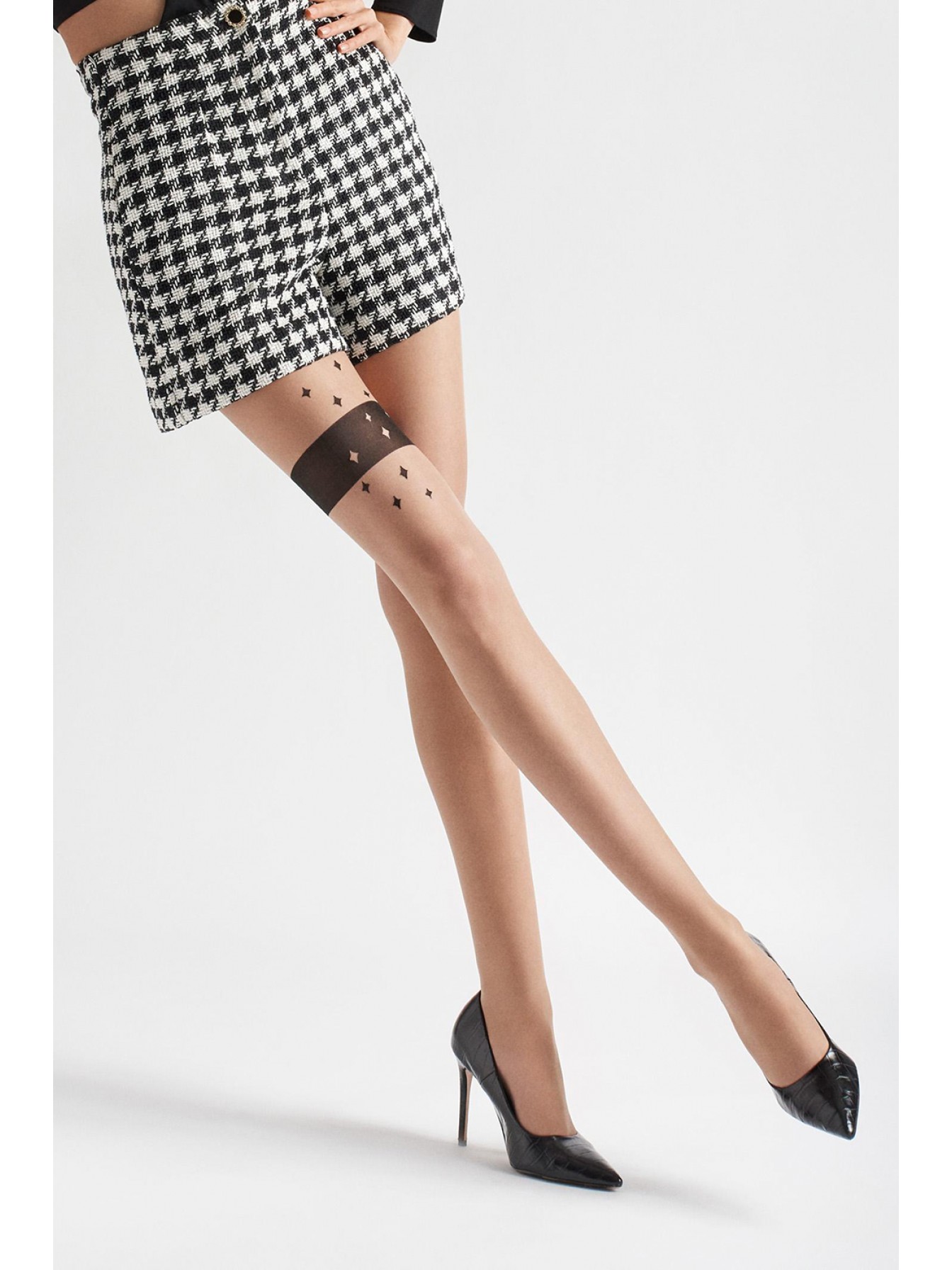 Стильные колготки Emmy Z05 20 den, с рисунком на передней части бедра. Плоские швы, небольшая ластовица, удобный эластичный пояс и невидимое усиление мыска.
