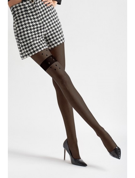 Стильные колготки Emmy Z05 20 den, с рисунком на передней части бедра. Плоские швы, небольшая ластовица, удобный эластичный пояс и невидимое усиление мыска.