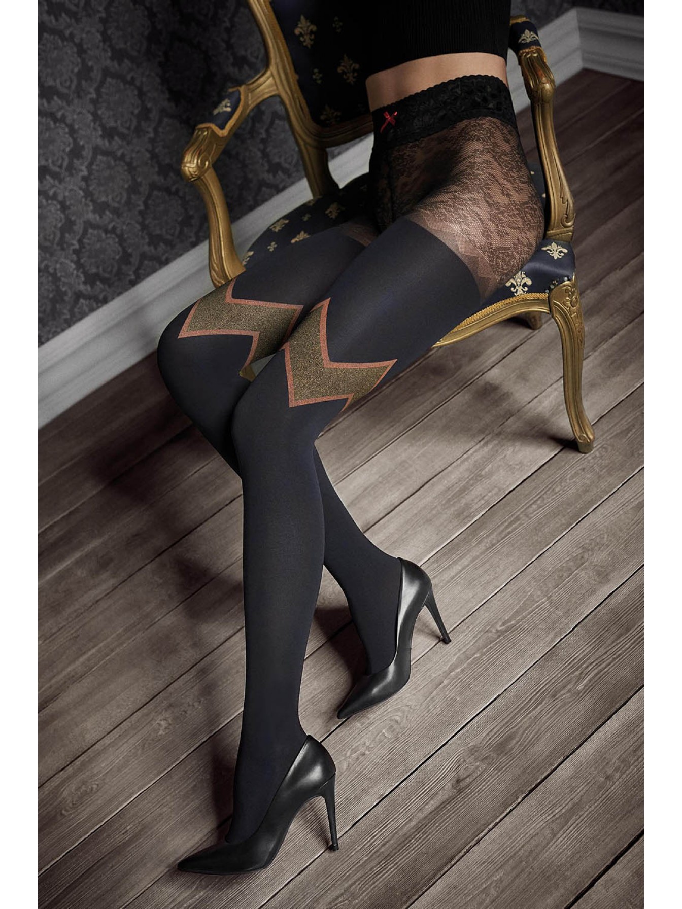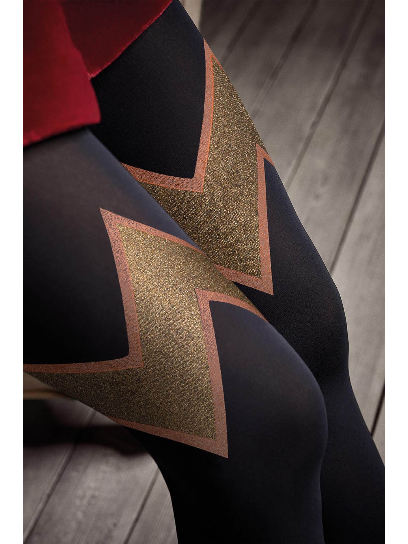 Элегантные колготки Gucci G48 60 den выполнены из микрофибры. Колготки декорированы блестящим геометрическим узором. Кружевной пояс с силиконовой полосой, предотвращающей скольжение колготок.