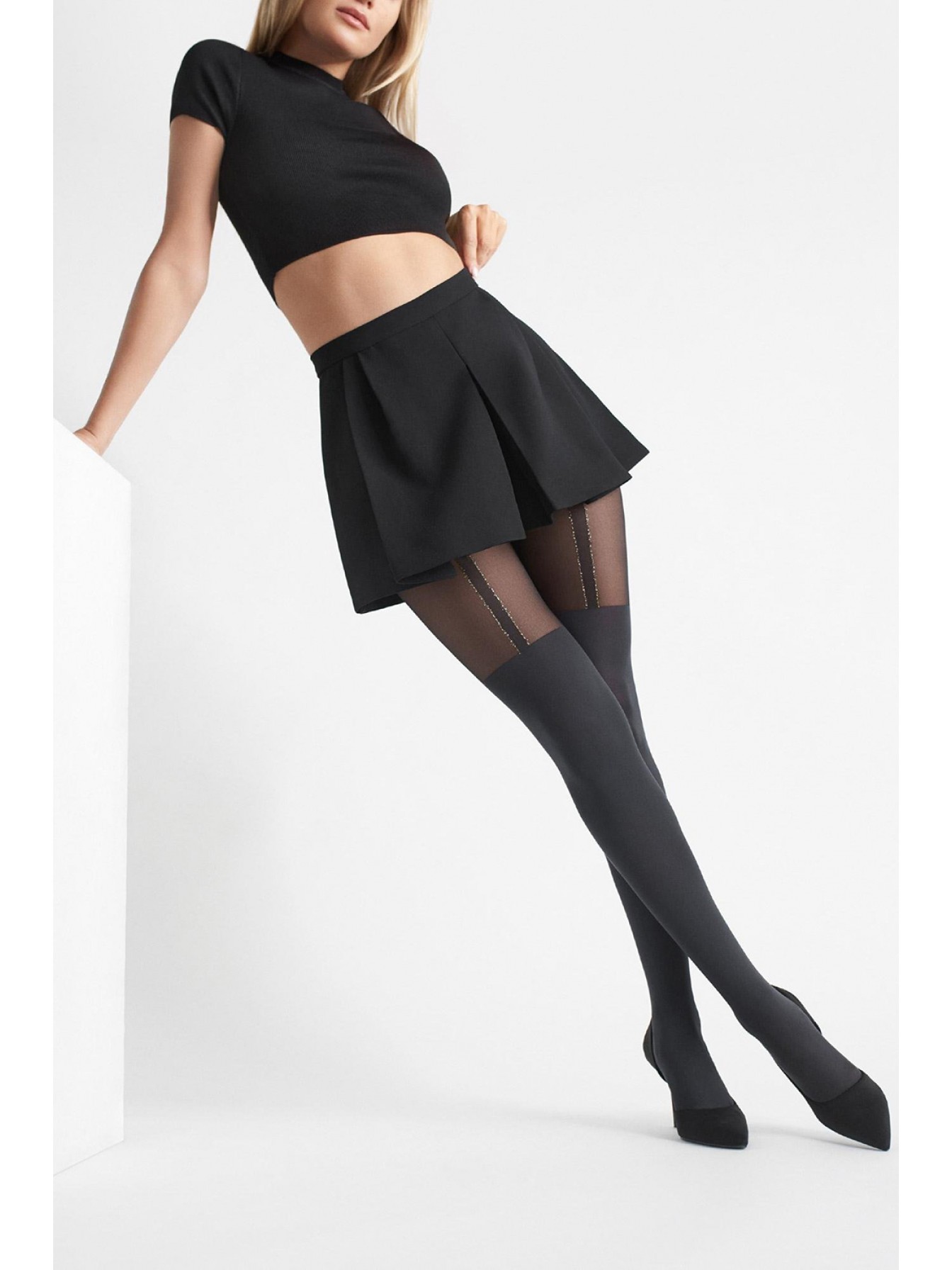 Стильные колготки Zazu B11 с имитацией чулок на подвязках. Плотность верхней части 20 den, нижней 60 den. Плоский шов, небольшая ластовица, удобный эластичный пояс и невидимое усиление мыска.