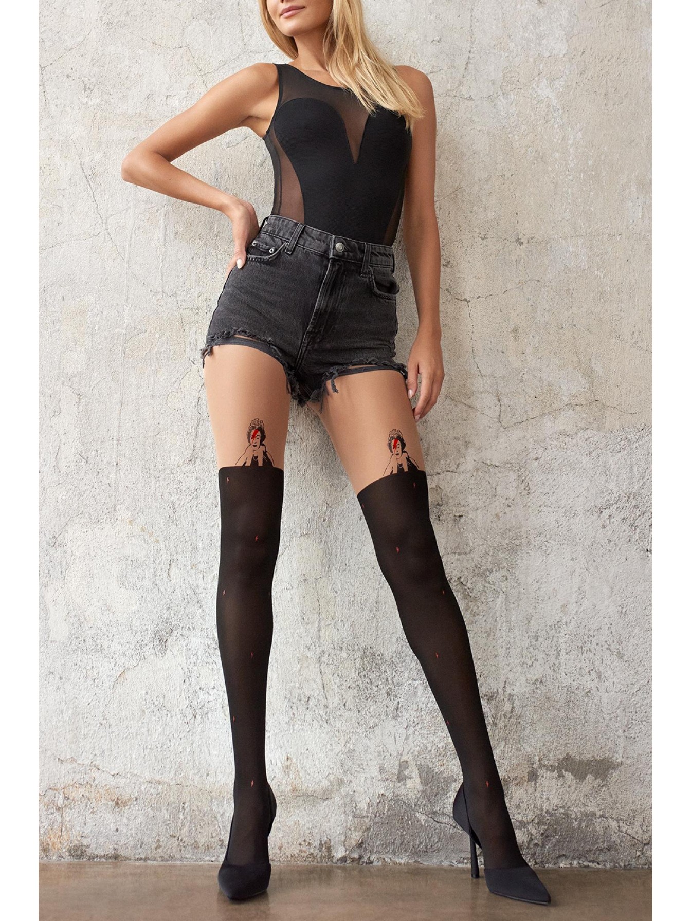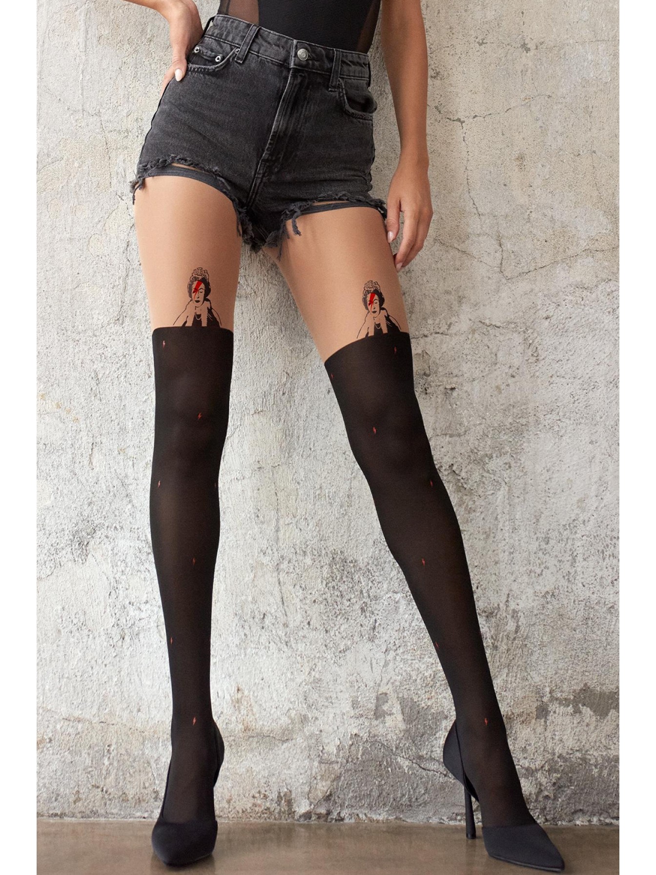 Стильные колготки Zazu Queen из линии Banksy с отсылками к Дэвиду Боуи. Плотность верхней части 20 den, нижней 60 den. Плоский шов, небольшая ластовица, удобный эластичный пояс и невидимое усиление мыска.