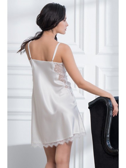 Короткая сорочка Mia-Amore на тонких бретелях из искусственного шелка в сочетании с нежнейшим кружевом. Отрезные кружевные чашки с подкладкой из тонкой сетки: в белом цвете – в тон изделия, в черном – бежевая, для соблазнительного эффекта голого тела. Спереди и на спинке – боковые кружевные вставки. Низ изделия декорирован кружевом.