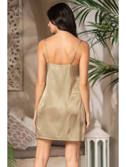 Короткая сорочка Mia-Amore без подреза на тонких бретелях выполнена из принтованного мелкоузорчатым геометрическим паттерном искусственного шелка. Прекрасный компаньон к домашнему халату с аналогичной отделкой.