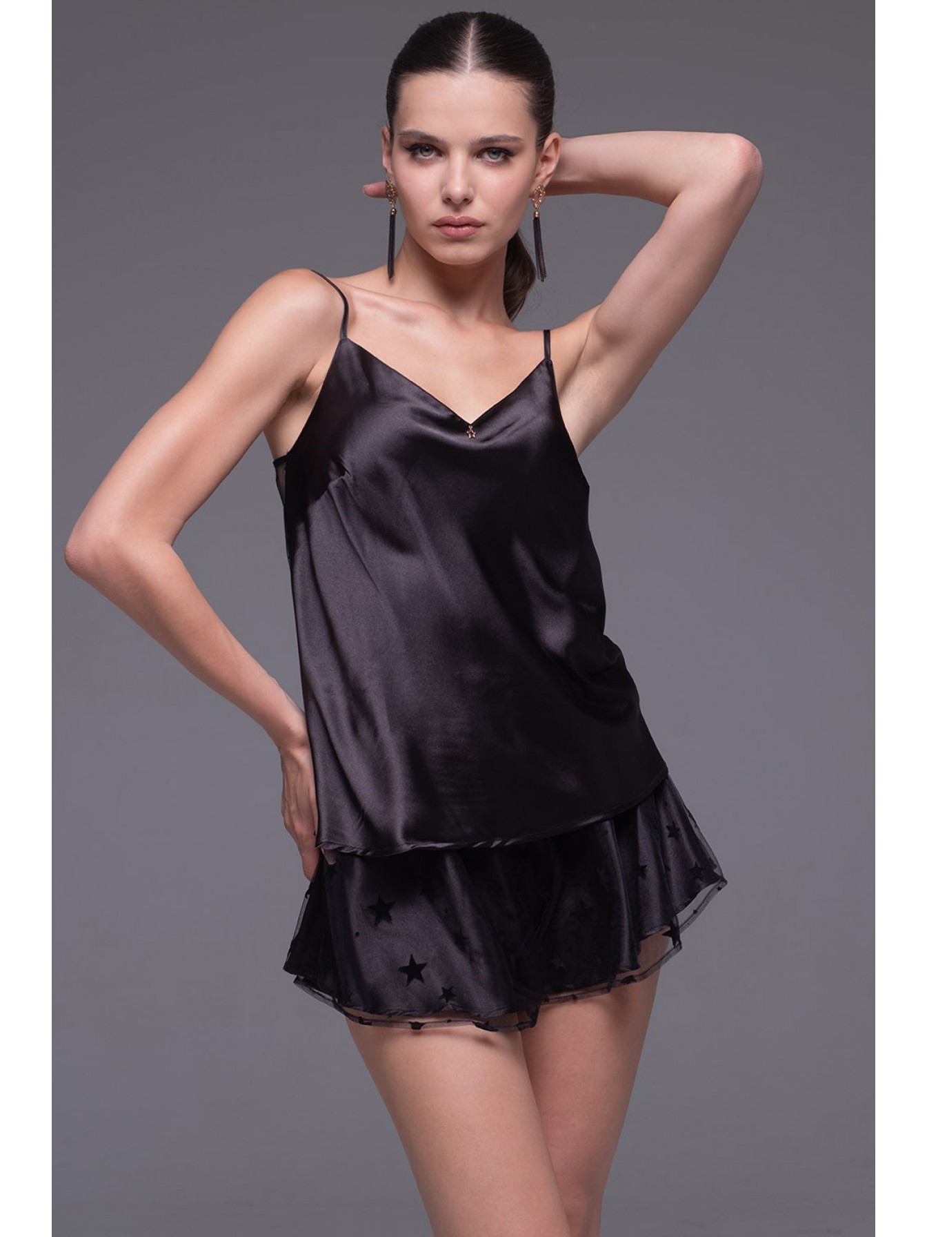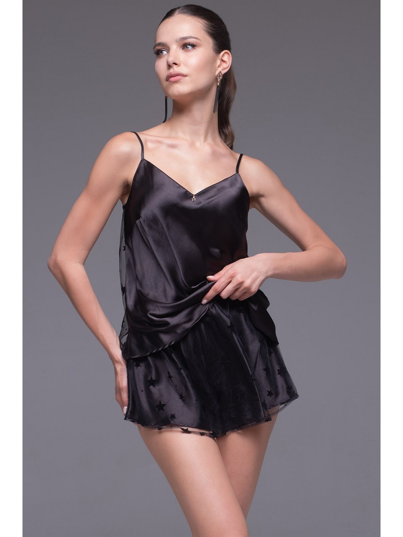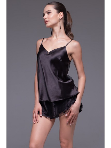 Оригинальный комплект-двойка Mia-Amore выполнен из смесового шёлка в сочетании с сеткой. Топ с атласной передней частью, по спинке вставка из сетки. Двойные пышные шортики выполнены из атласа, сверху отделка из сетки, декорированная звёздочками.