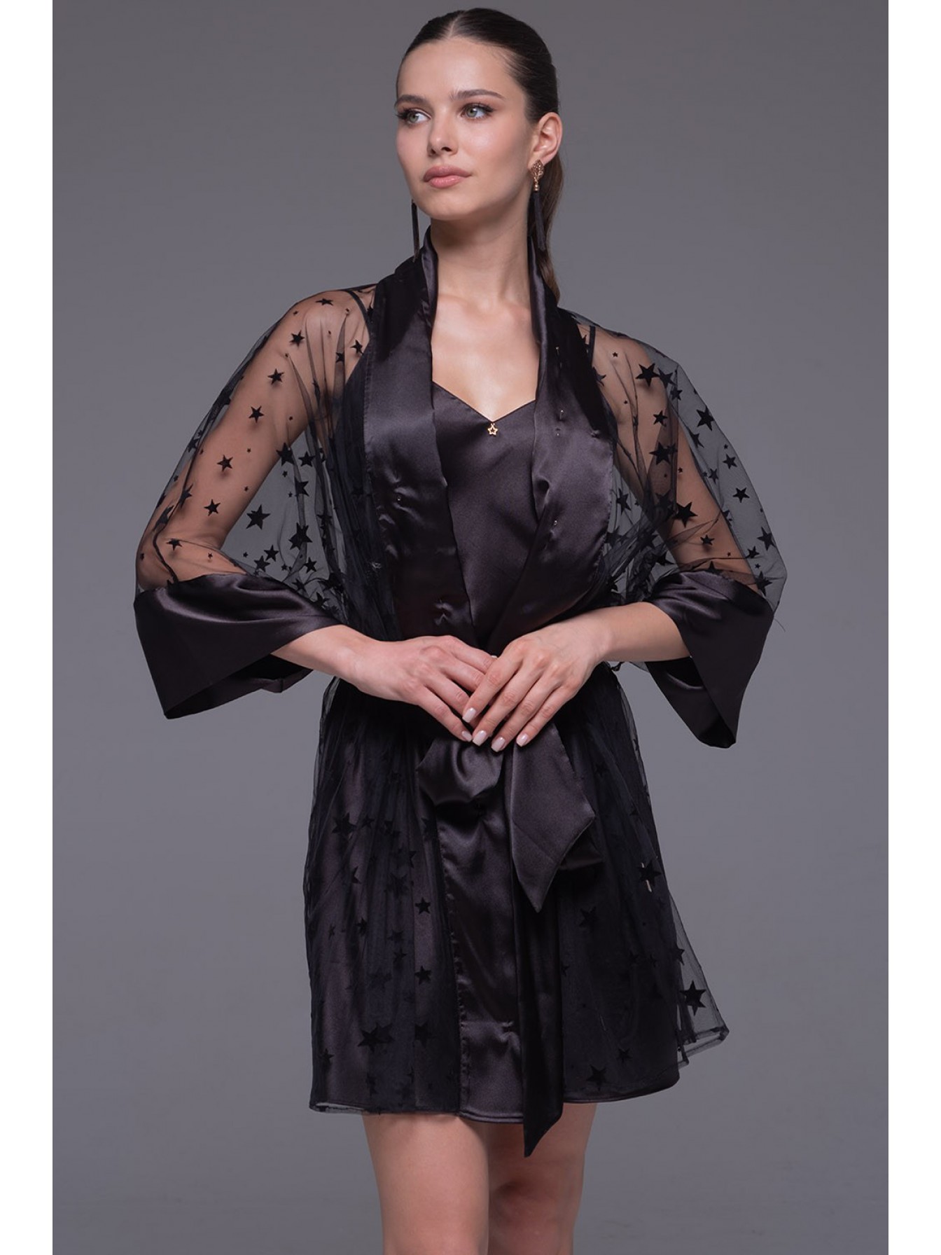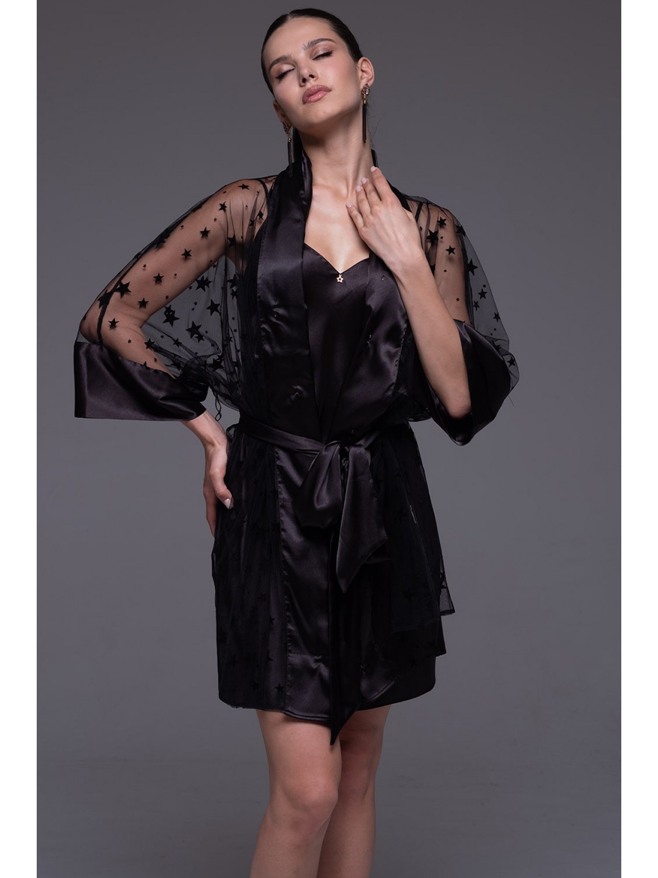 Короткий халат Mia-Amore выполнен из сетки в сочетании с атласными планкой и манжетами. Халат завязывается на широкий атласный пояс.