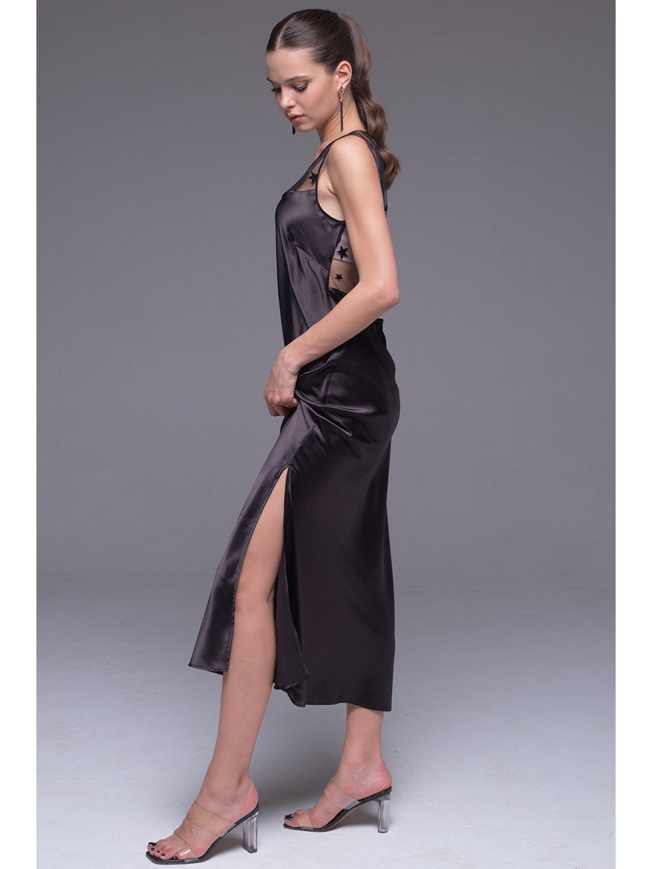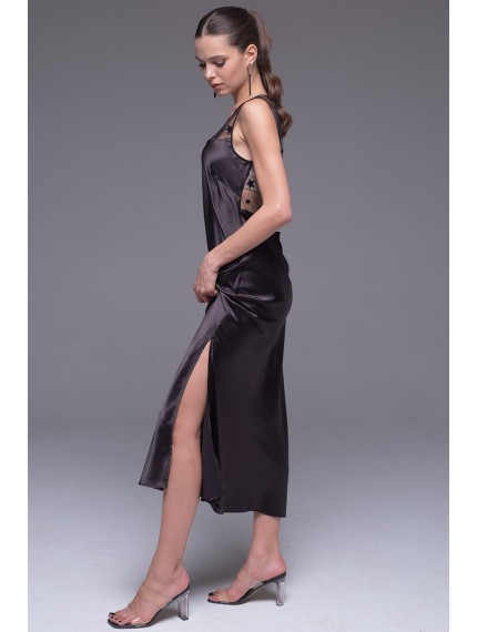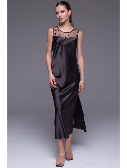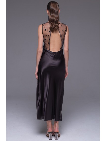 Длинная сорочка Mia-Amore выполнена из смесового шёлка в сочетании с сеткой. Спереди на лифе вставка из сетки, соблазнительный вырез на спинке также оформлен сеткой со звёздочками.