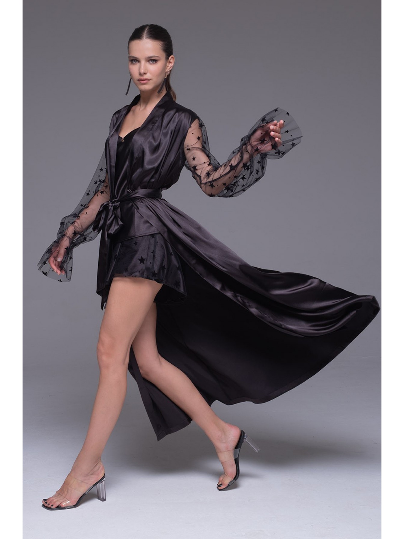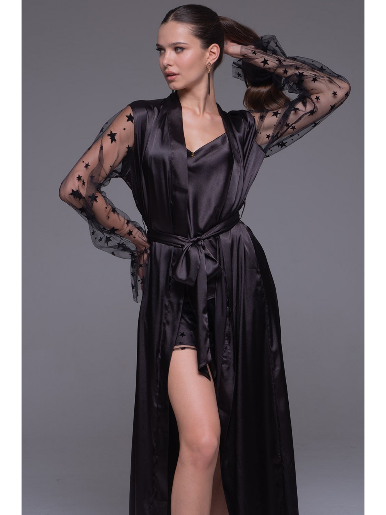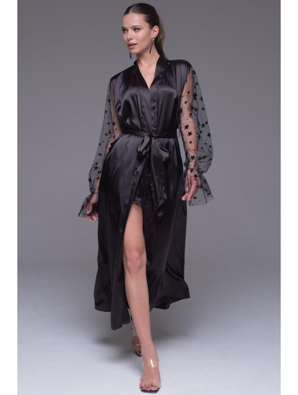 Длинный халат Mia-Amore выполнен из смесового шёлка. Декоративной частью халата являются эффектные широкие рукава из сетки с резинкой по низу и широкой оборкой. Халат запахивается широким атласным поясом.