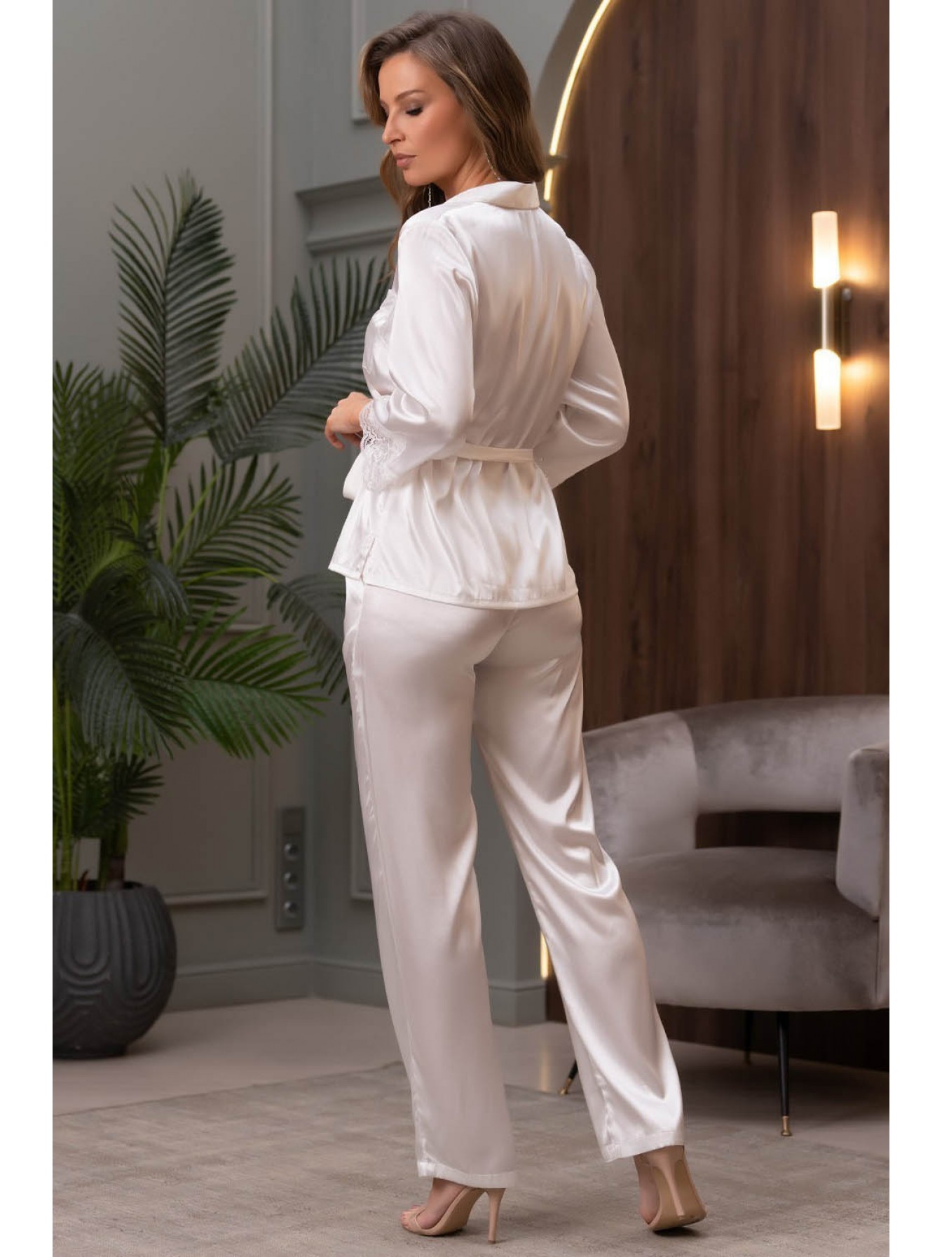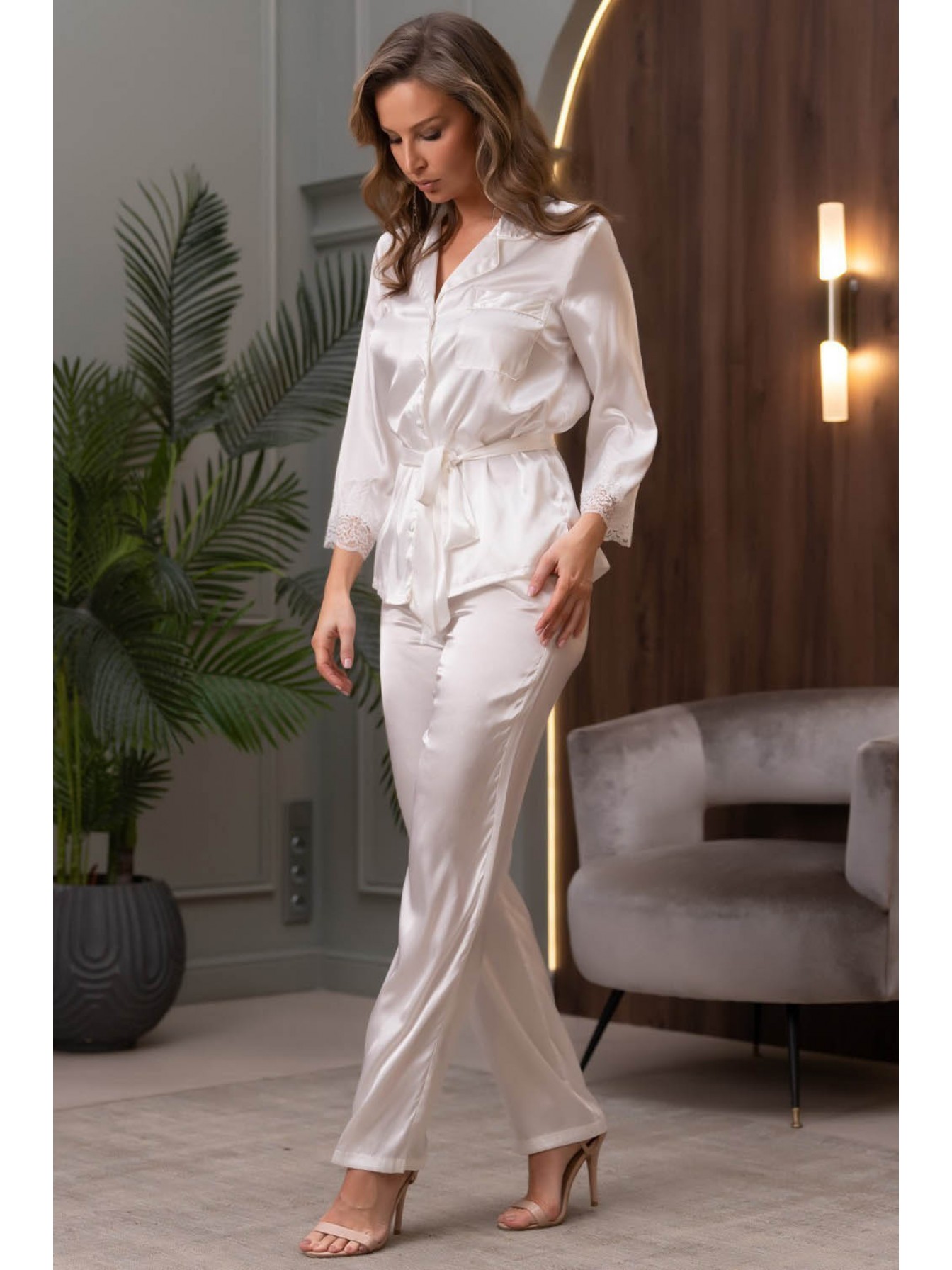 Комплект Mia-Amore из жакета на пуговицах с брюками выполнен из однотонного смесового шелкового полотна. Рукава жакета по низу декорированы ,  , ажурным мягким кружевом, по краю борта жакета – контрастный атласный кант, на груди маленький декоративный кармашек.
