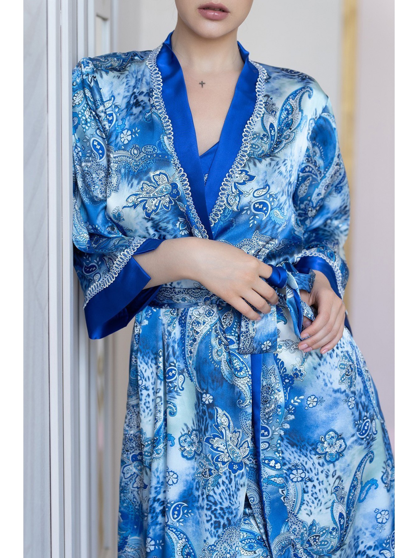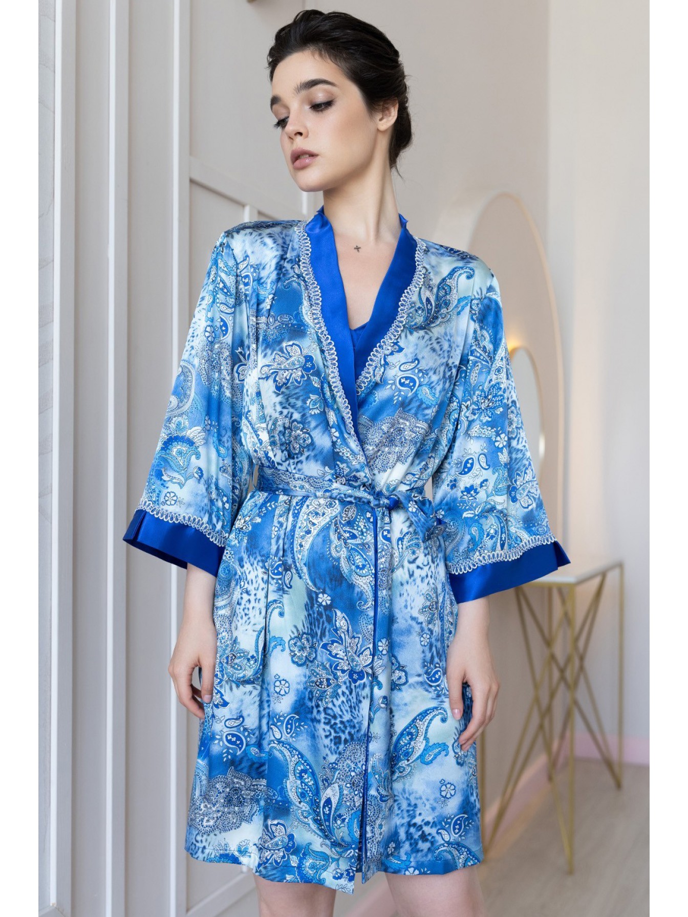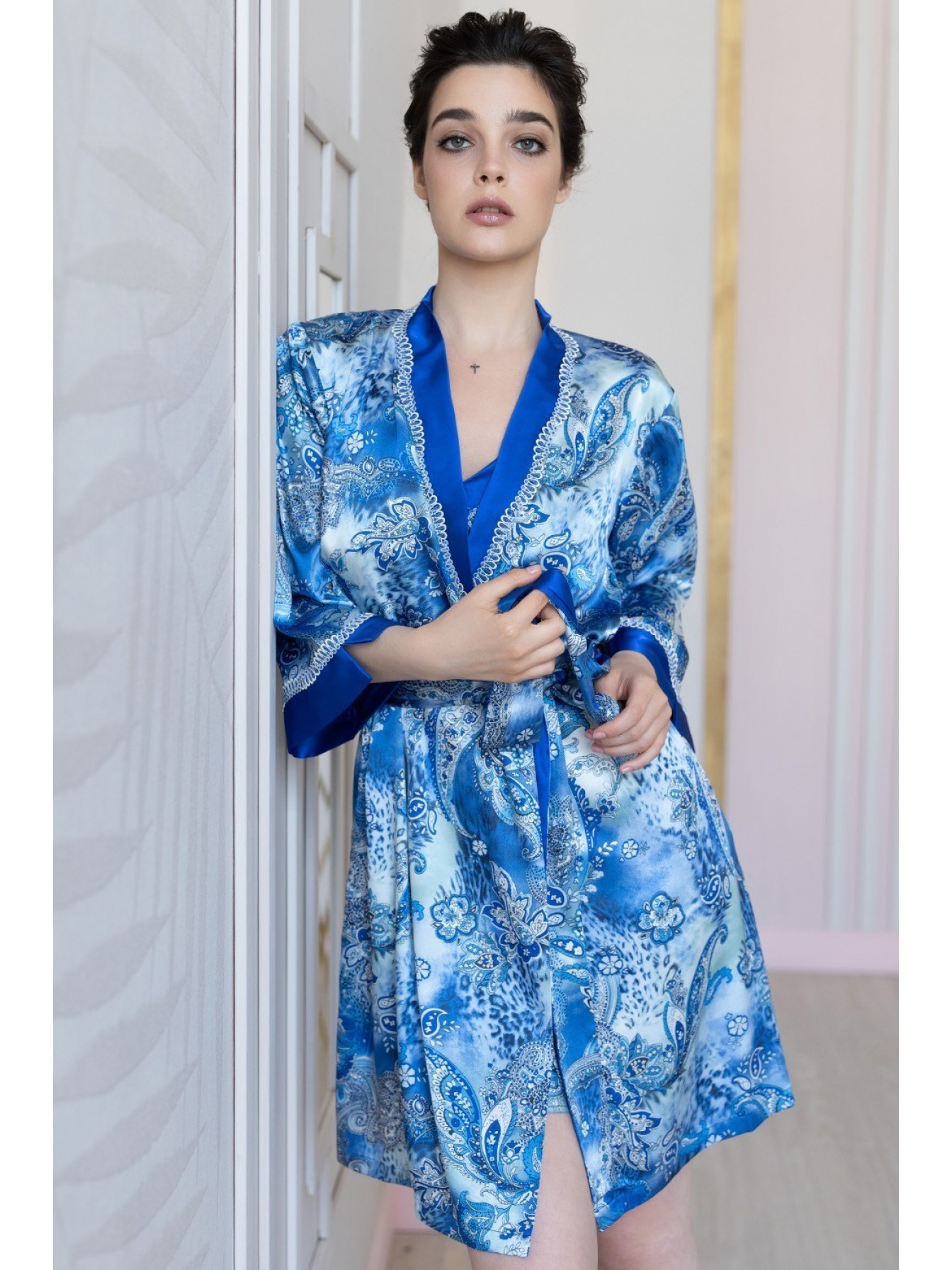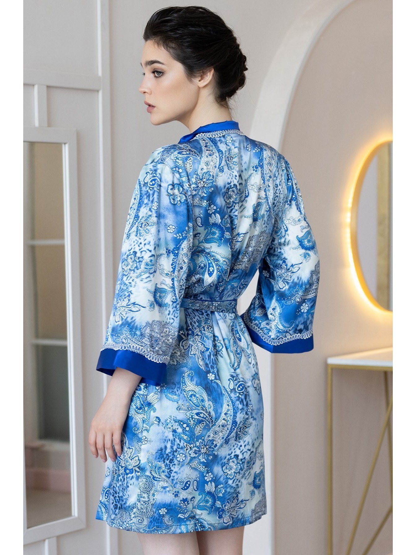 Короткий халат–кимоно Mia-Amore выполнен из принтованной смесовой ткани. Верх бортов и низ рукавов декорированы однотонным атласом и узким кружевом. По бокам расположены карманы.