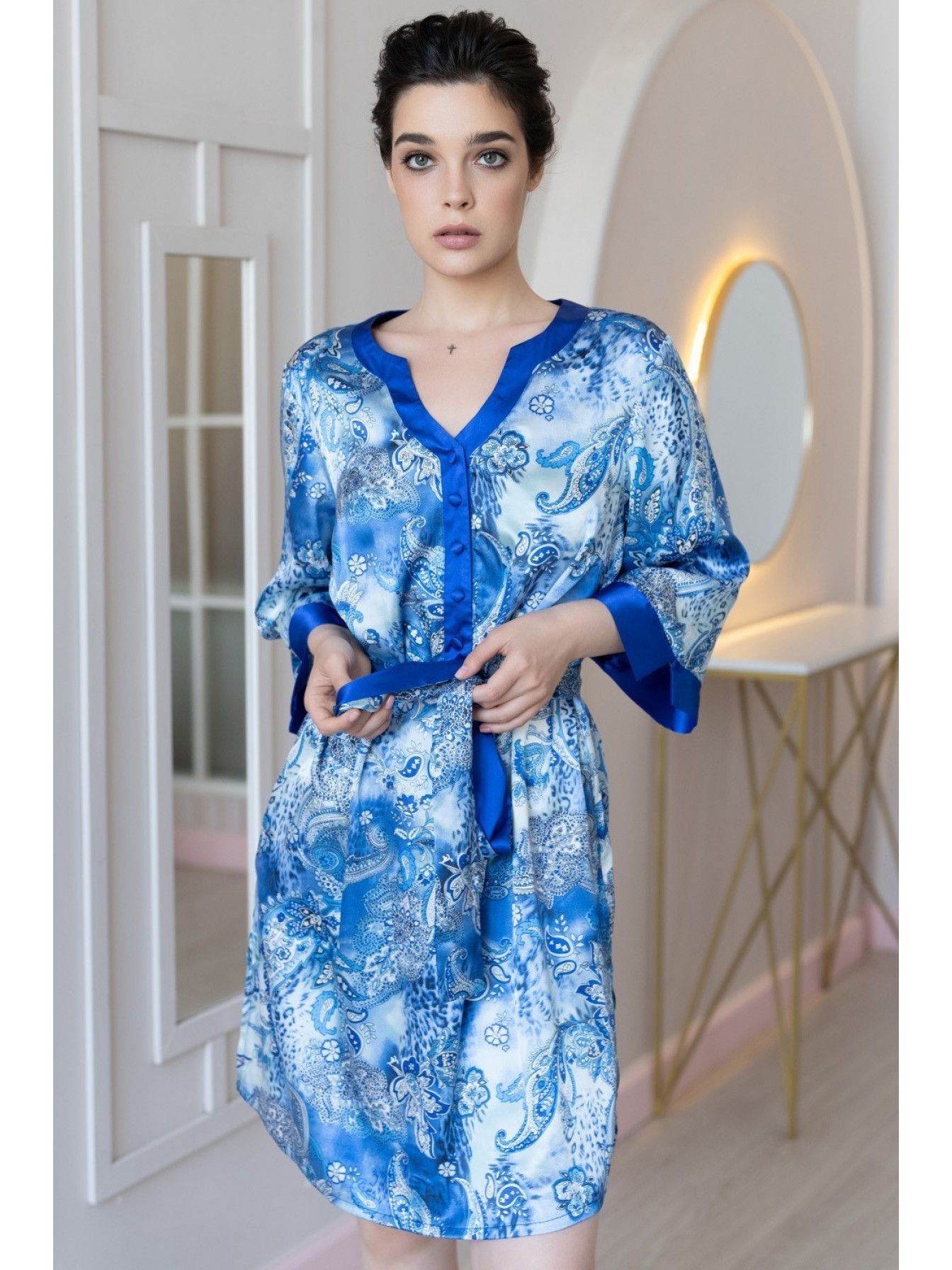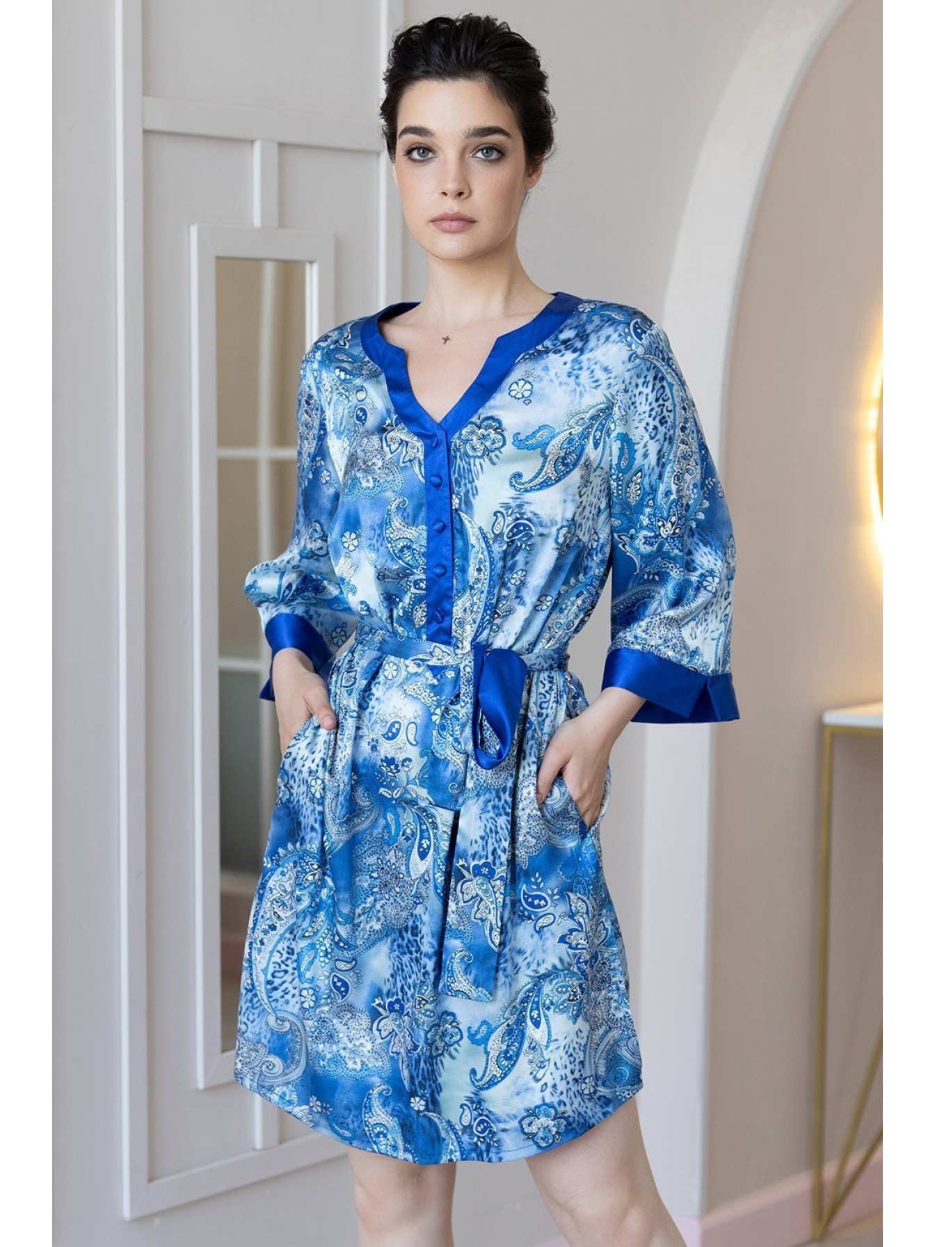 Туника Mia-Amore свободного покроя с рукавом длиной ?, выполнена из принтованной смесовой ткани. Планка и низ рукавов декорированы однотонным атласом. В боковых швах расположены карманы, а понизу разрезы.