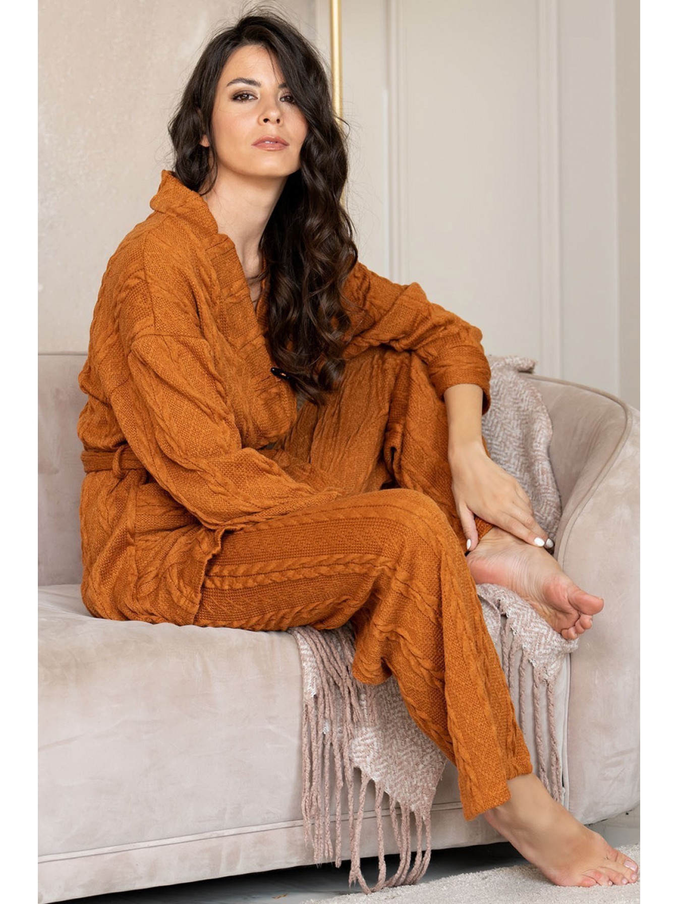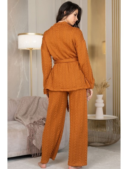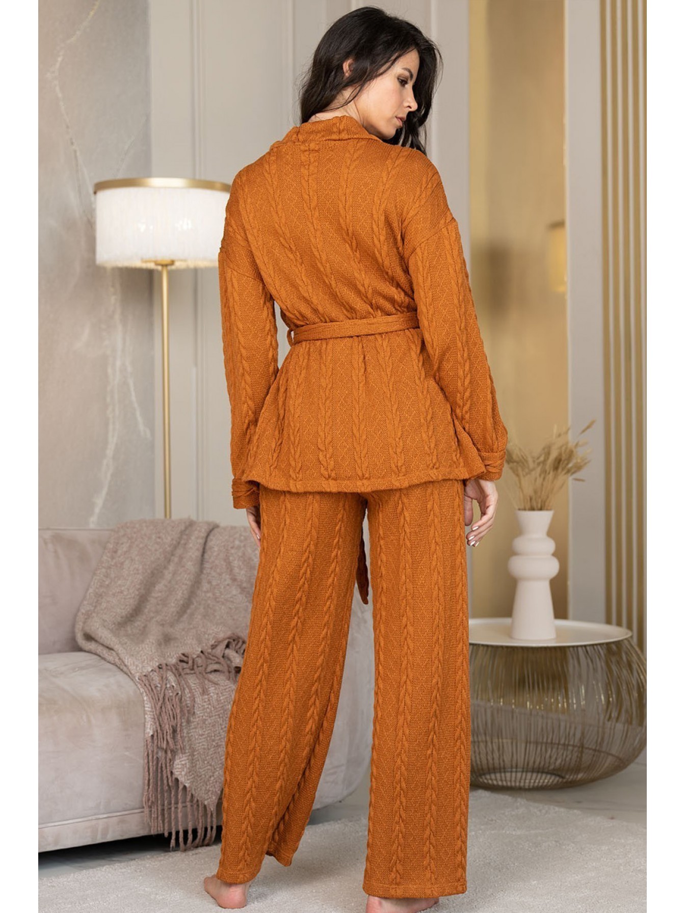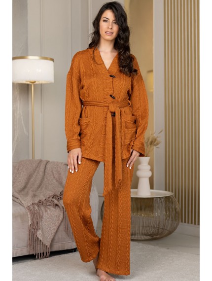 Комплект Mia-Amore состоит из кардигана и брюк. Кардиган свободного силуэта с застежкой на пуговицах, с длинными рукавами, низ которых обработан манжетами. На полочках расположены накладные карманы. Свободные брюки с широким эластичным поясом и кулисой. Линию талии можно подчеркнуть за счет пояса, который идет в комплекте. Комплект выполнен из трикотажного полотна с фактурной вязкой.