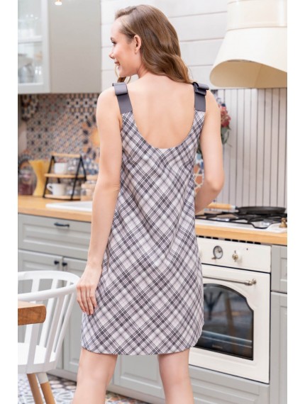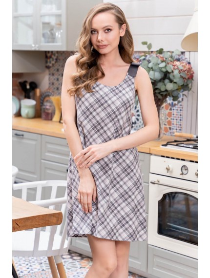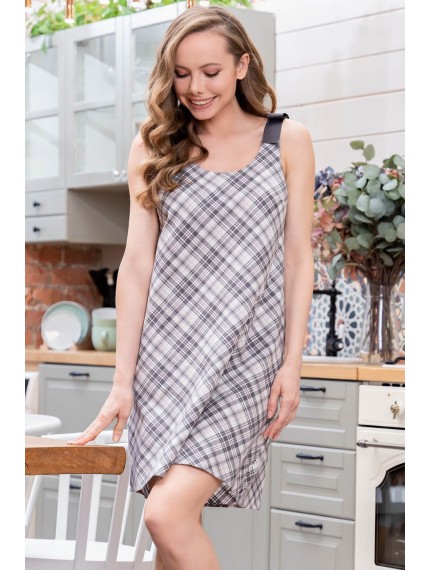 Короткая сорочка Mia-Amore из натурального хлопкового полотна с рисунком в виде серо-розовой клетки. Декоративный элемент сорочки - широкие комфортные бретели из гладкой серой тесьмы, закрепленной в виде банта.