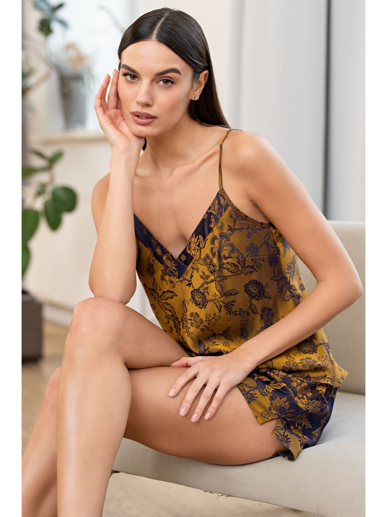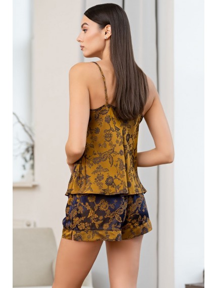 Комплект Mia-Amore состоит из топа на тонких бретелях и шорт. Изделия комплекта выполнены из шелка с вискозой на жаккардовой основе с эффектом «хамелеон». Для отделки модели используется цветовая инверсия. На шортах обработаны карманы, по низу шорт расположены разрезы.