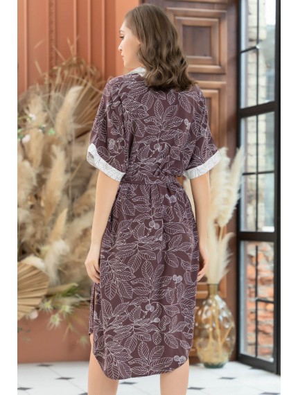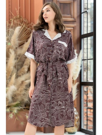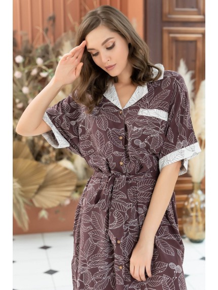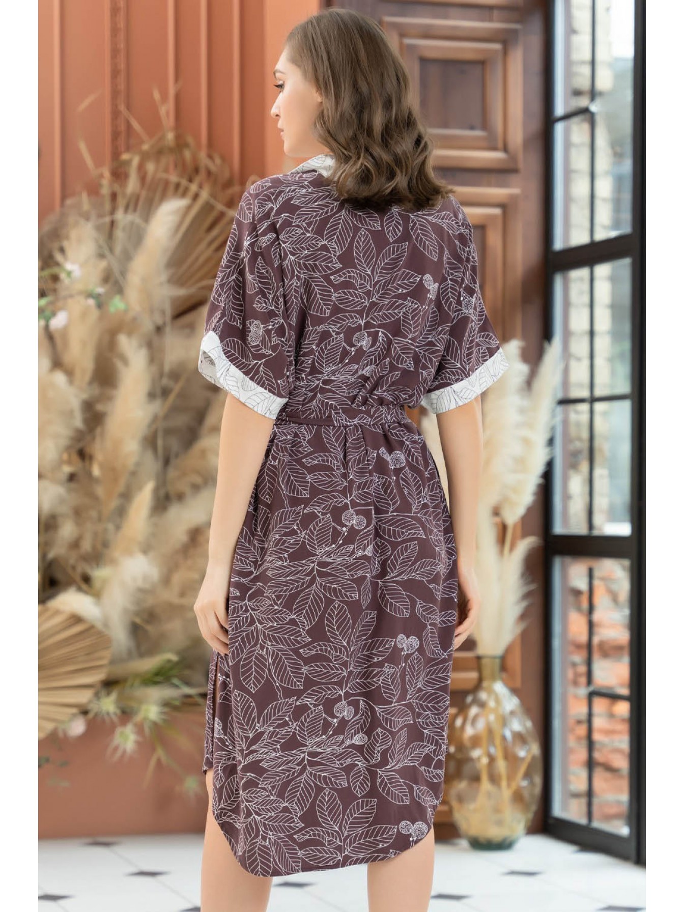 Платье-рубашка Mia-Amore длиной ниже колен с центральной застежкой на пуговицы с цельнокроенными спущенными рукавами выполнена из тёмной принтованной вискозы. По бокам модели разрезы, в боковых швах карманы. По талии силуэт можно подчеркнуть поясом. Манжеты и воротник выполнены из светлого компаньона.
