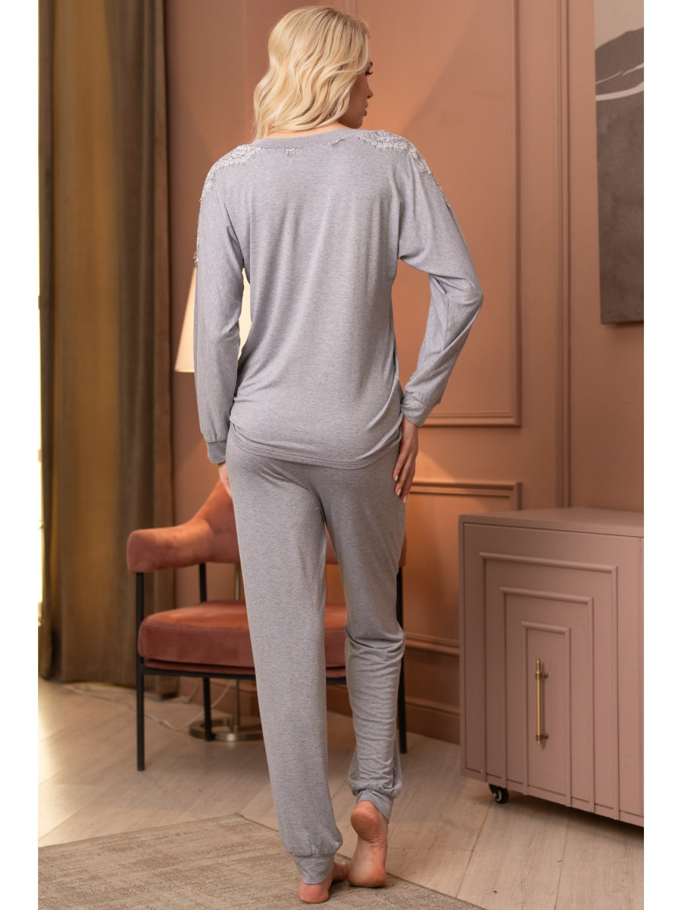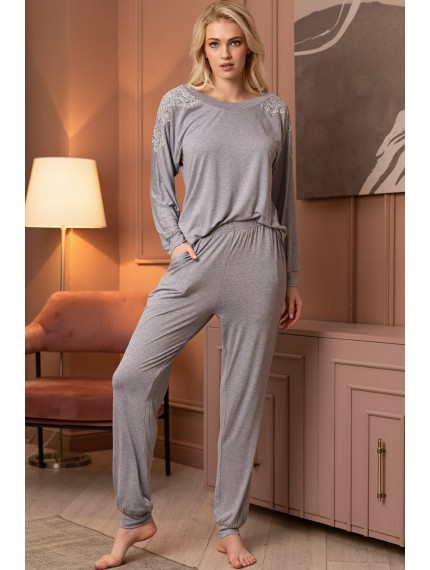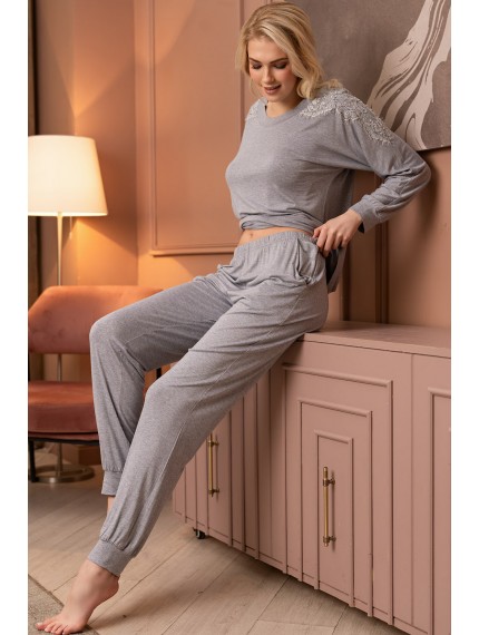 Комплект Mia-Amore с брючками выполнен из меланжевого трикотажного полотна. Лонгслив имеет на плечах вставки из эластичного кружева. Комплект дополняют удобные брючки на резинке, низ которых оформлен эластичными манжетами.