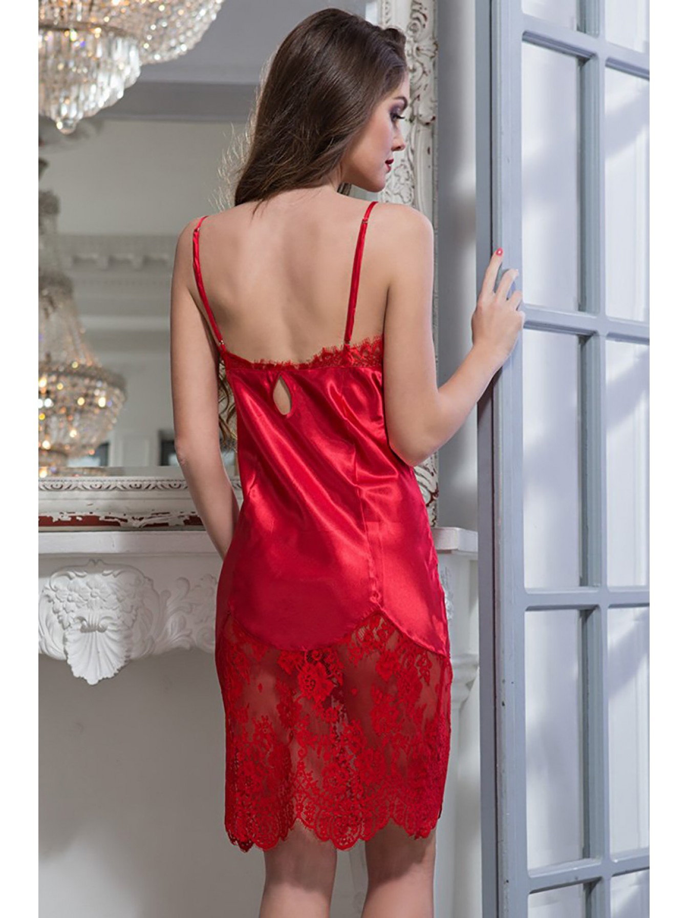 Оригинальная сорочка Mia-Amore средней длины из шелкового атласа декорирована ажурным французским кружевом Шантильи (, Chantilly), . Рельефы сорочки выгодно подчеркивают силуэт. Лиф сорочки декорирован изящным бантиком со сверкающей подвеской.