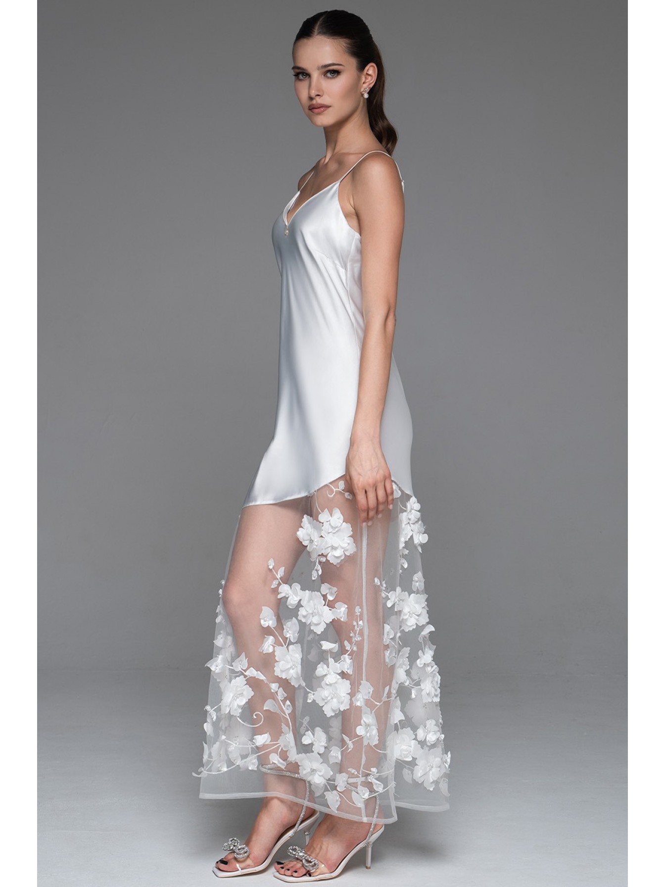 Длинная сорочка Mia-Amore на тонких регулируемых бретелях. Сорочка выполнена из смесового шёлка. Низ сорочки от колен украшен воланом из сетки, которая по низу декорирована объёмными цветами.