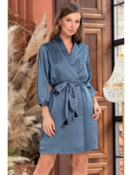 Короткий халат Mia-Amore с рукавами длиной 3/4 выполнен из мягкого однотонного креп-сатина. Планка горловины, манжеты рукава, нагрудная листочка и пояс декорированы контрастным тонким кантиком. На спинке кокетка с декоративной складкой. Халат подвязан широким поясом с декоративными кисточками. В боковых швах карманы.