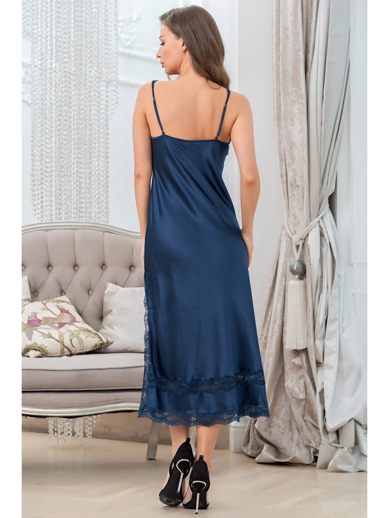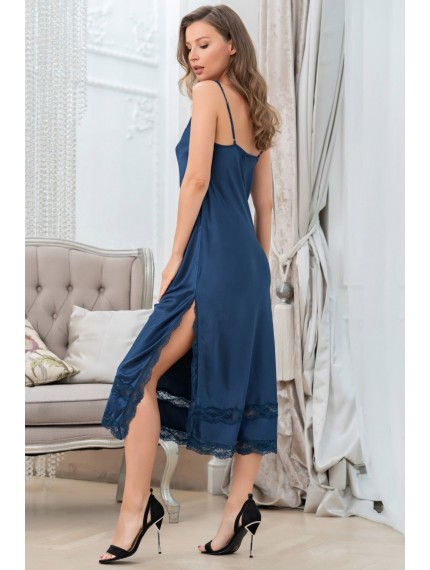 Длинная элегантная сорочка Mia-Amore полуприлегающего силуэта на тонких бретелях, выполнена из однотонного смесового шелка и декорирована узким ажурным кружевом, которое расположено по вырезу, низу и краям разреза сорочки. Центр выреза украшен атласным бантиком с подвеской.