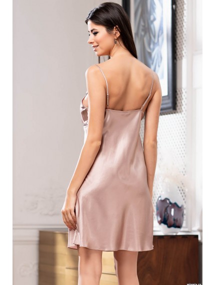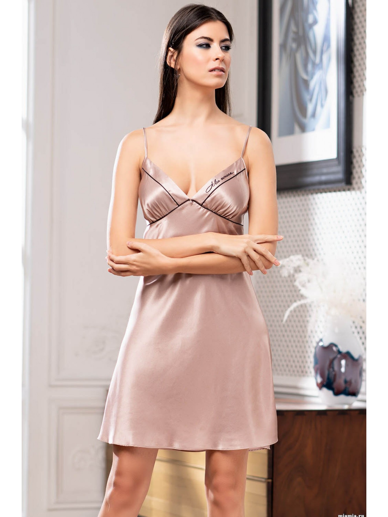 Короткая сорочка Gabriella на тонких бретелях с подрезом под грудью из однотонного смесового шелка с контрастными кантами, подчеркивающими конструктивные особенности. Вырез сорочки дополнен вышивкой. Декор - подвеска в виде маленького бантика со вставкой из эмали, расположена по центру выреза сорочки.