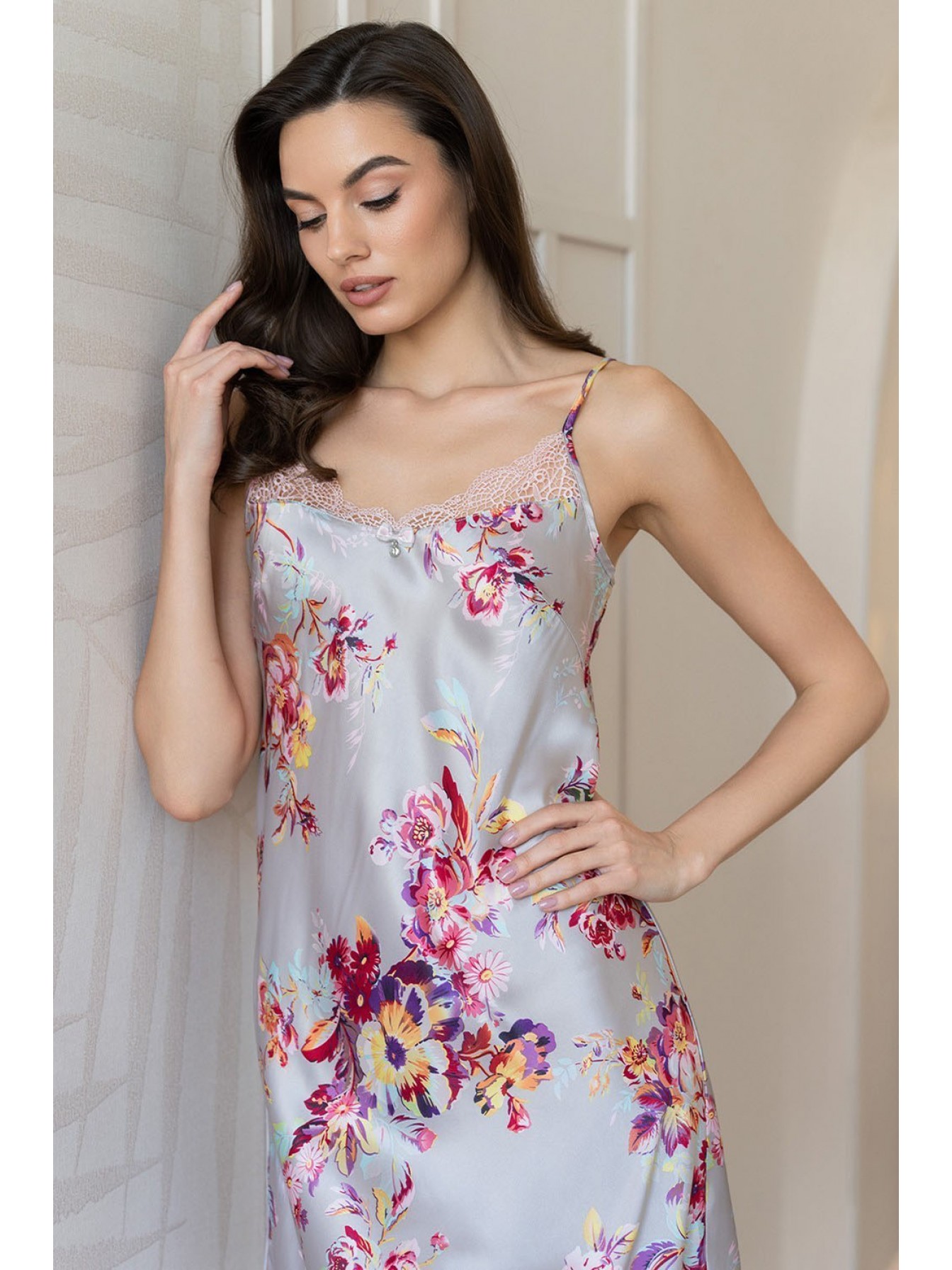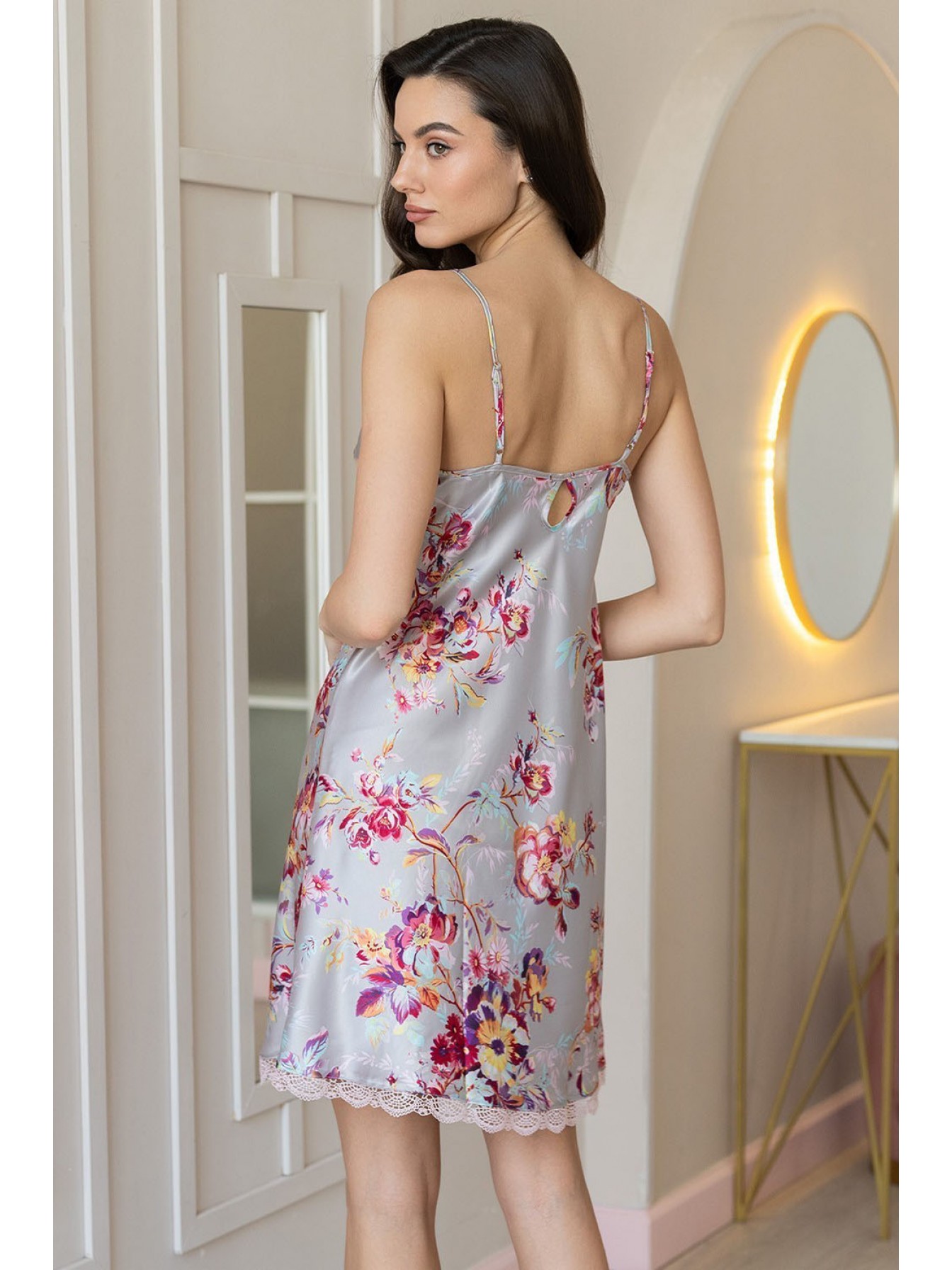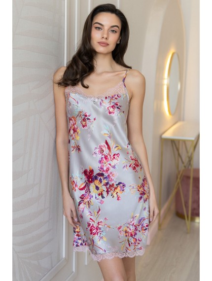 Сорочка Mia-Amore средней длины на тонких бретелях без подреза выполнена из принтованной смесовой ткани. Верх и низ сорочки обработаны узким кружевом. Декор - двухцветный атласный бантик по центру.