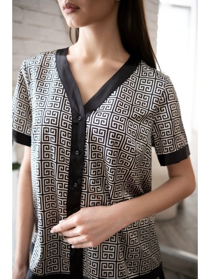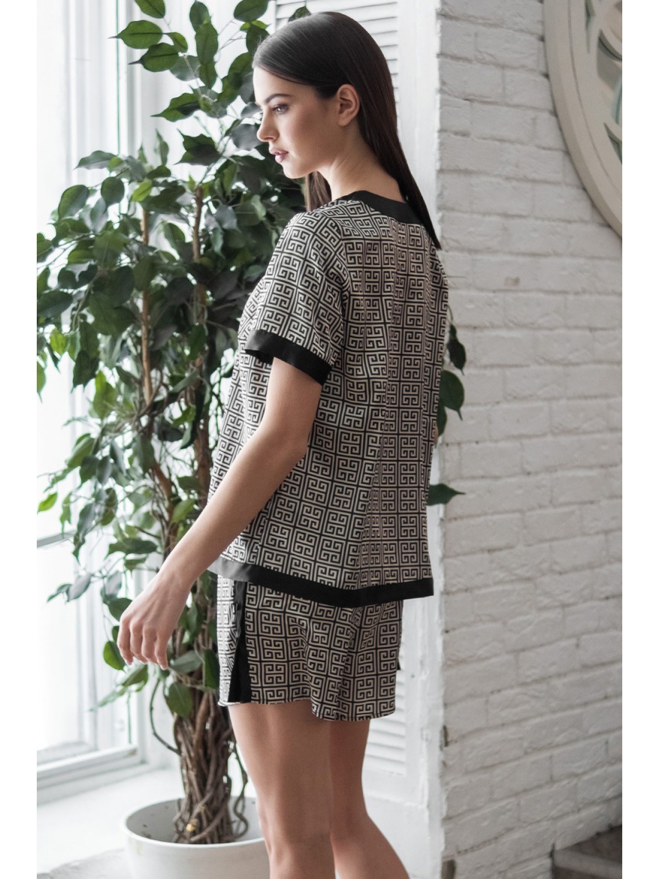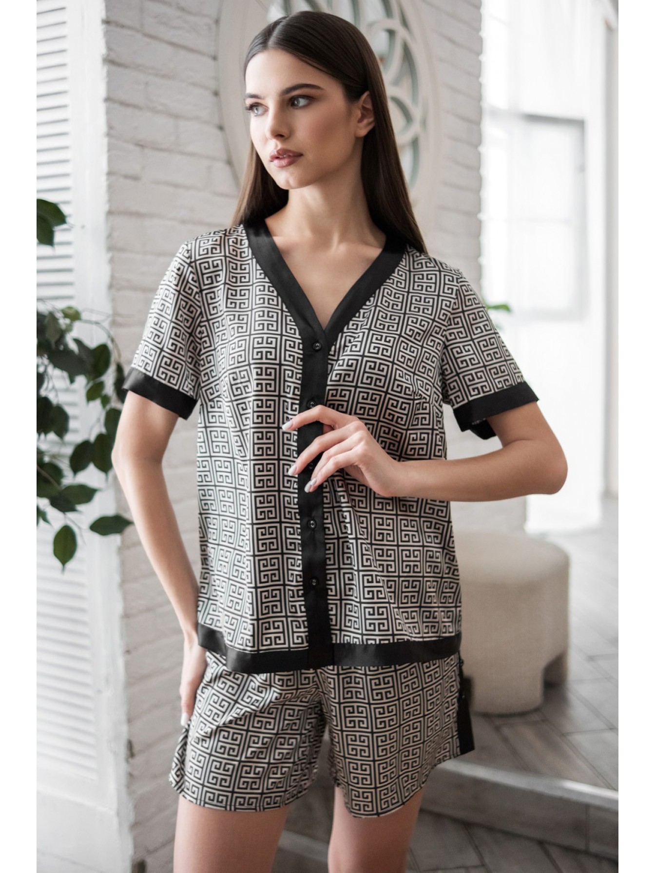 Комплект Mia-Amore состоит из жакета с коротким рукавом и шорт. Комплект выполнен из принтованного смесового шелка с однотонной отделкой. По бокам шорт расположены карманы.