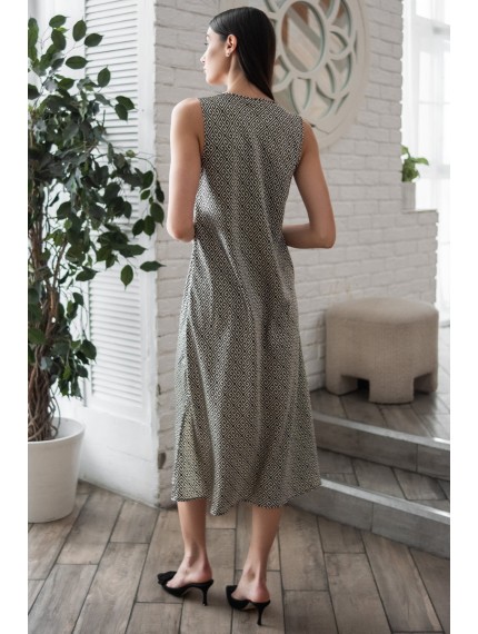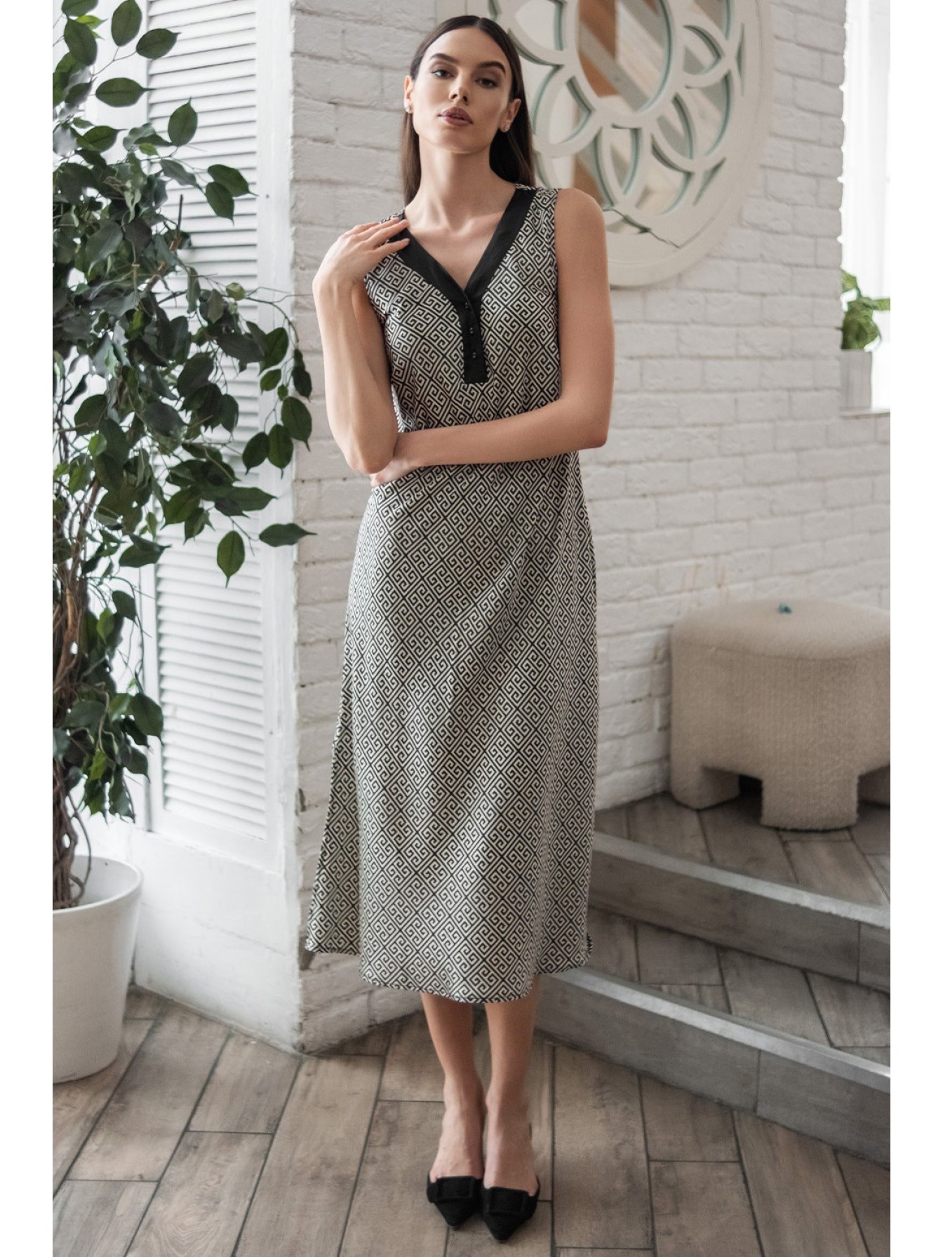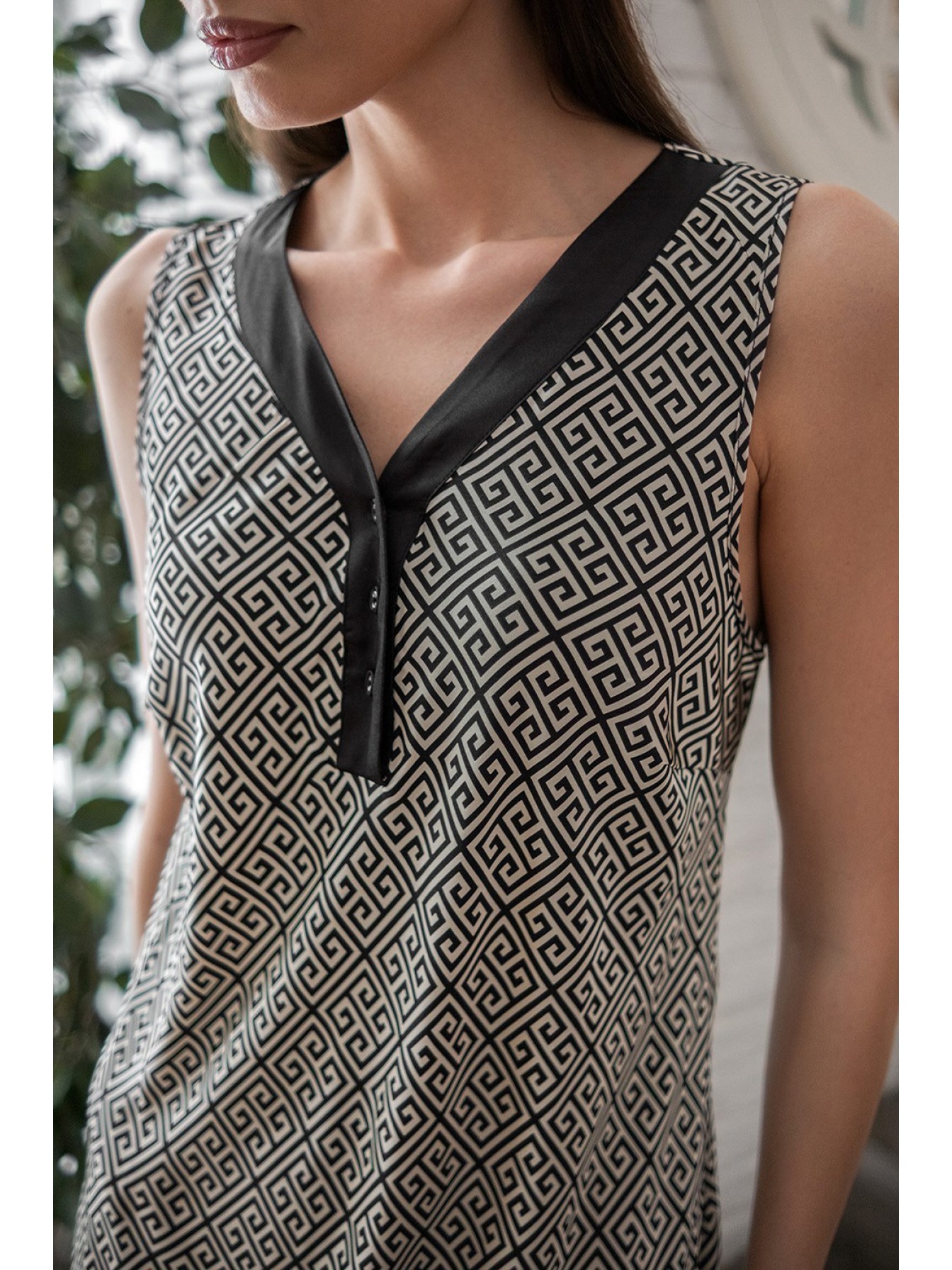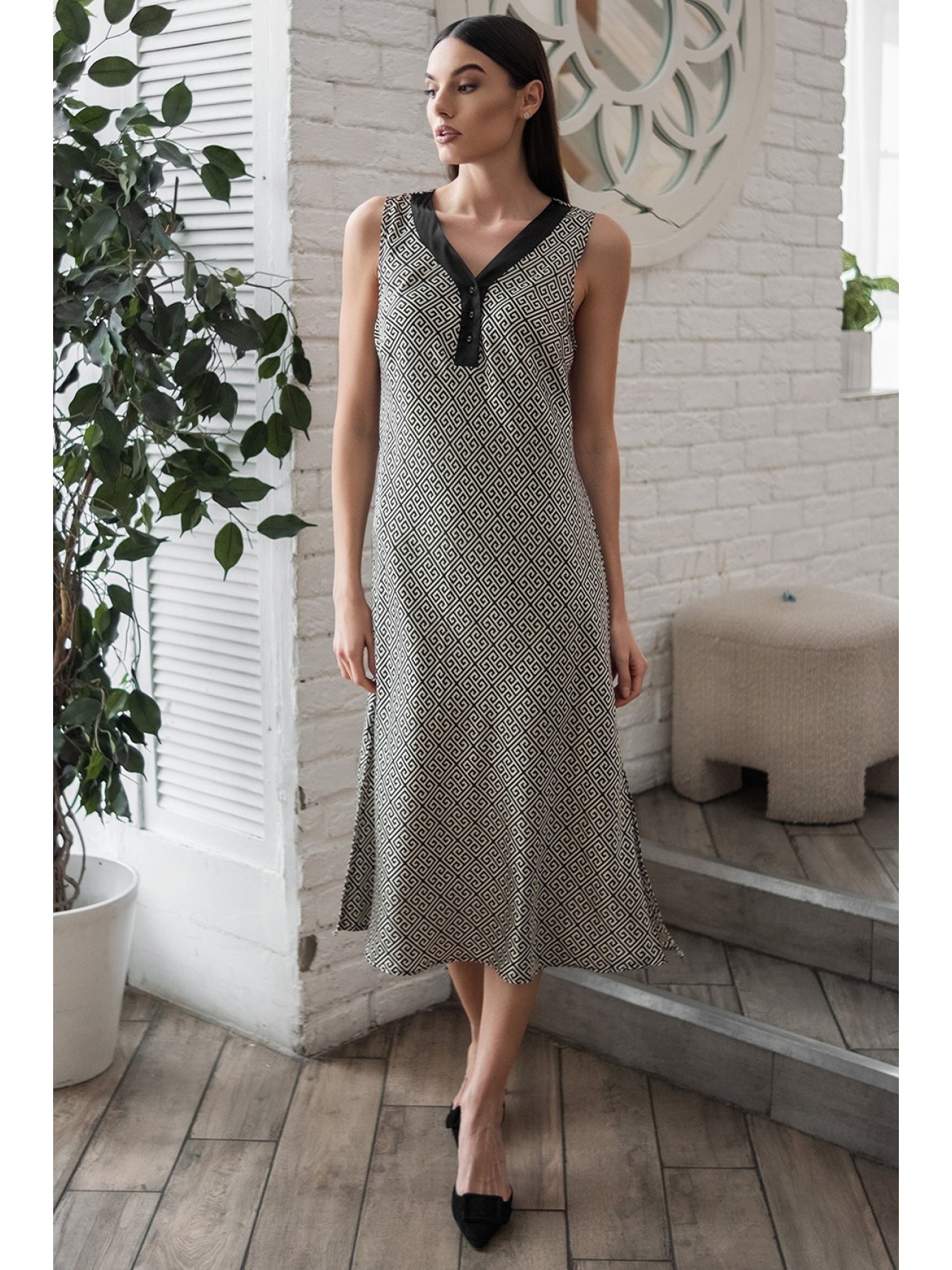 Длинная сорочка Mia-Amore на широких бретелях и застежкой на пуговицы по центру выреза, выполнена из принтованного смесового шелка с однотонной отделкой. По бокам обработаны разрезы для свободы движения.
