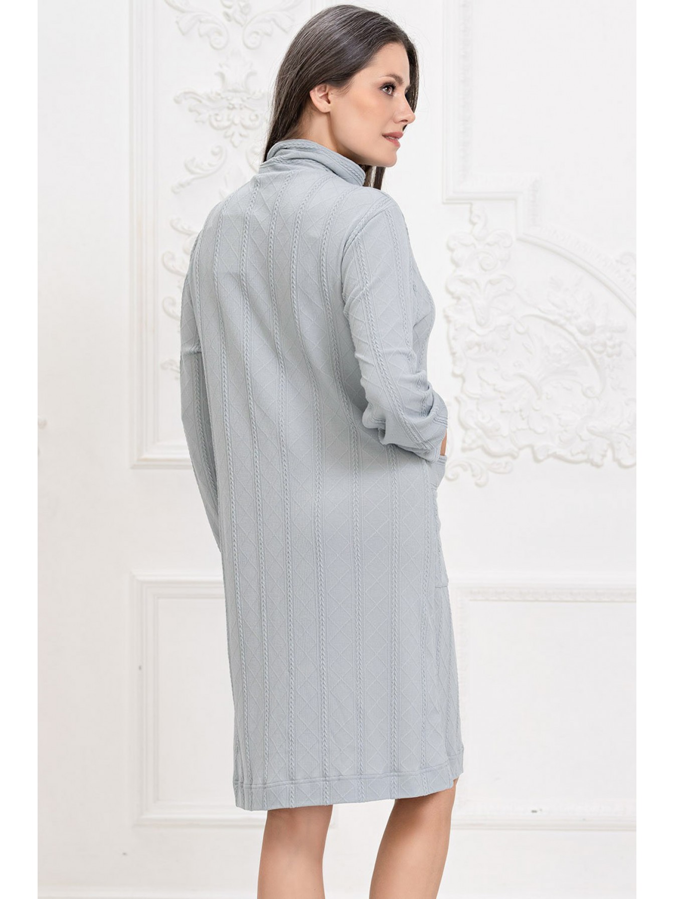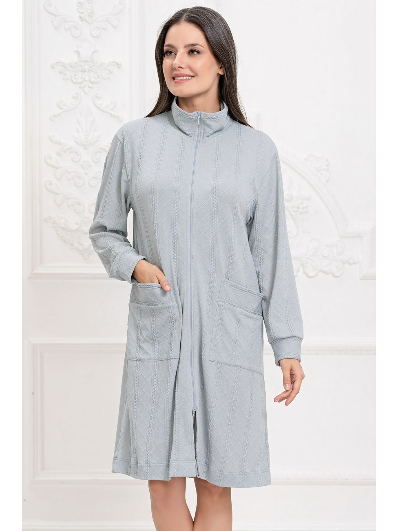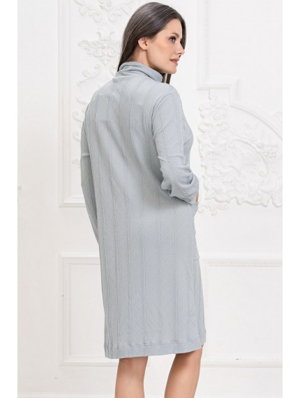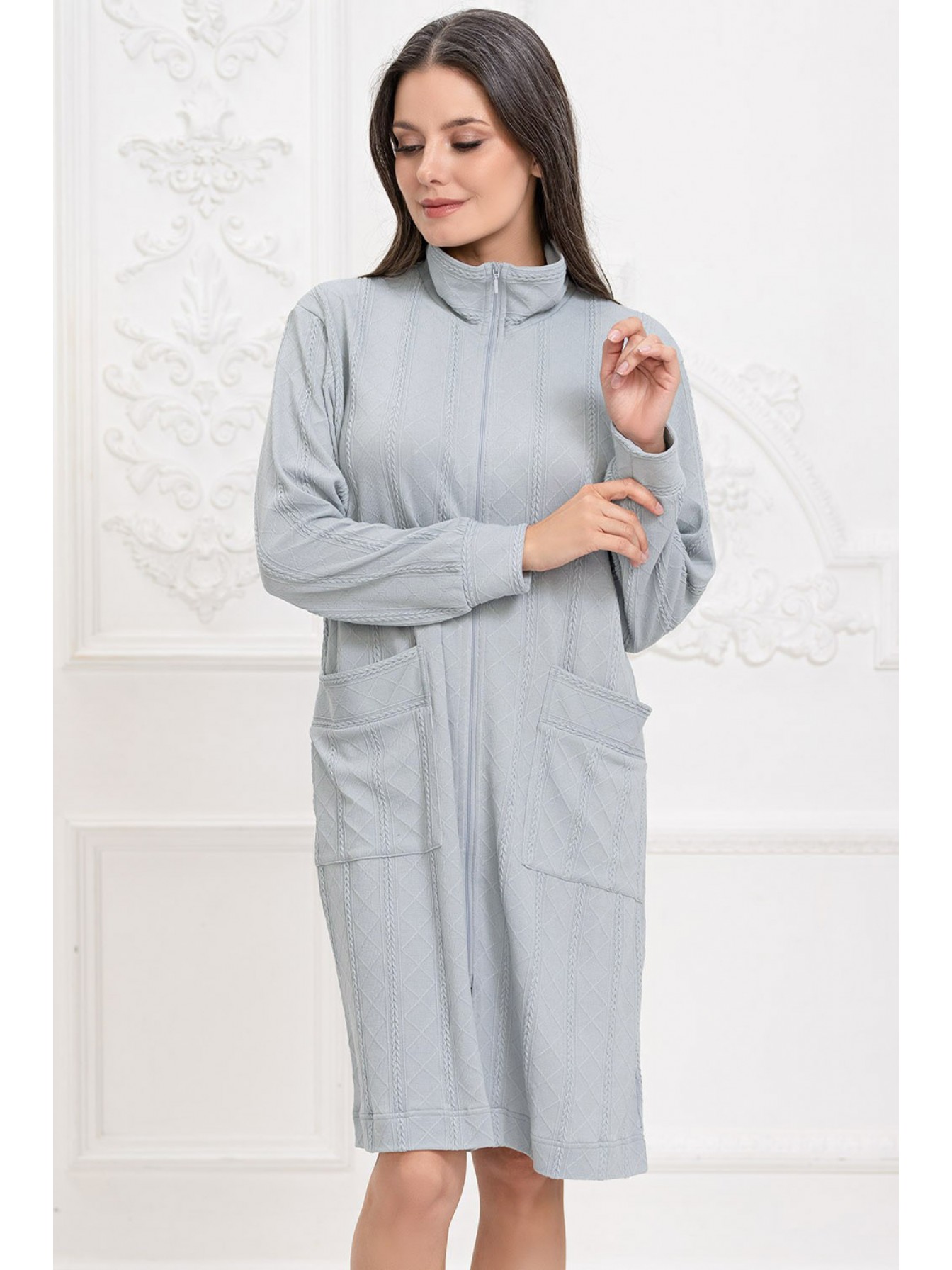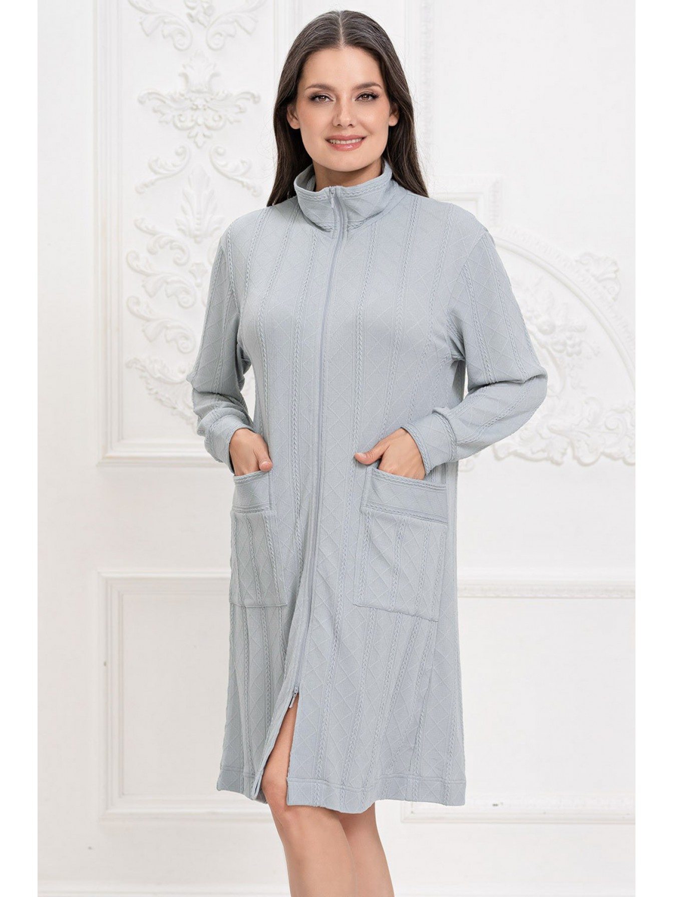 Халат Mia-Amore на молнии длиной до колен с воротником-стойкой выполнен из трикотажного полотна c фигурной вязкой. Низ длинного рукава халата обработан манжетами. На полочках расположены накладные карманы.