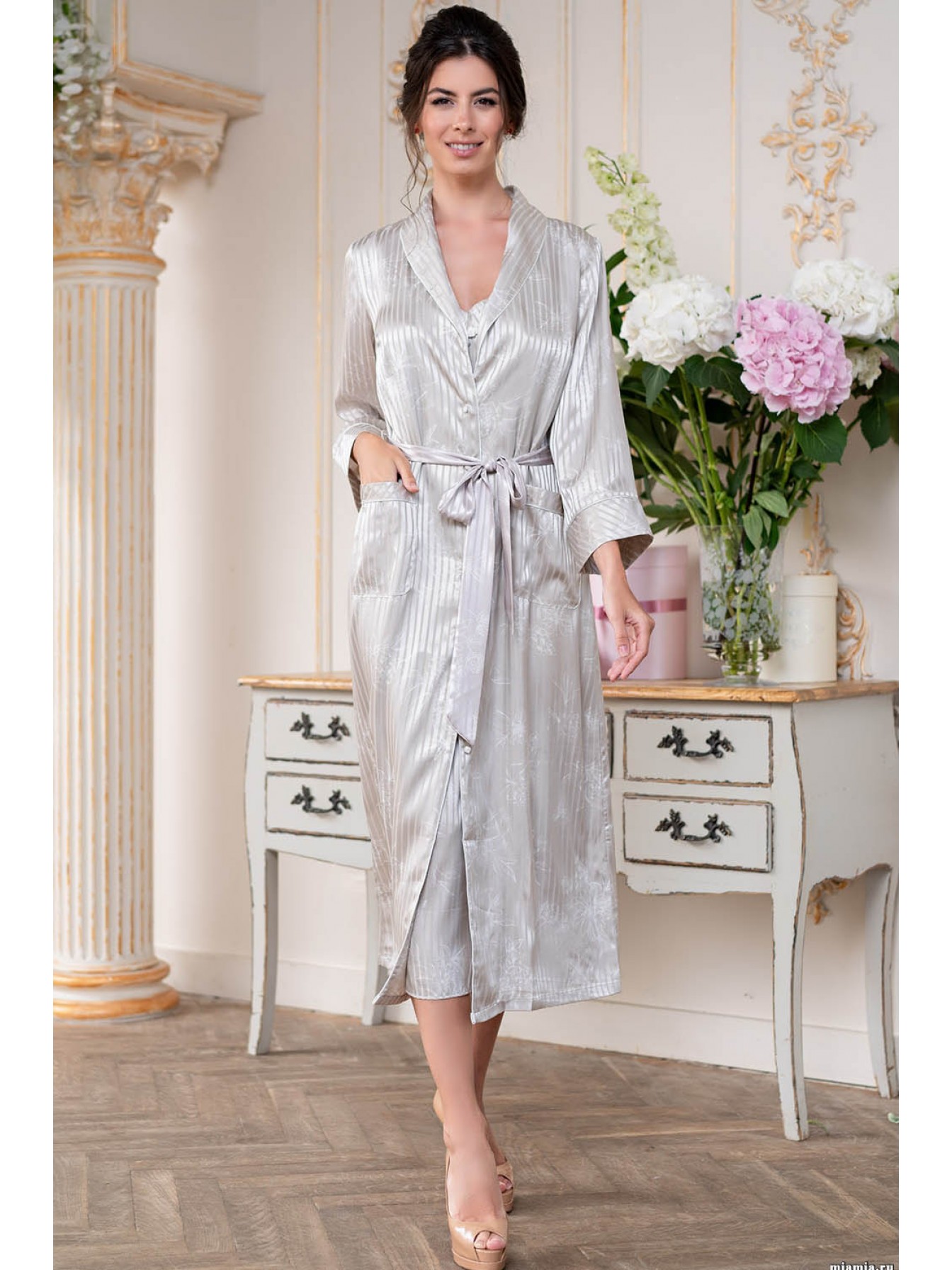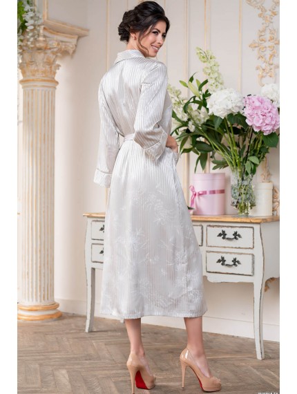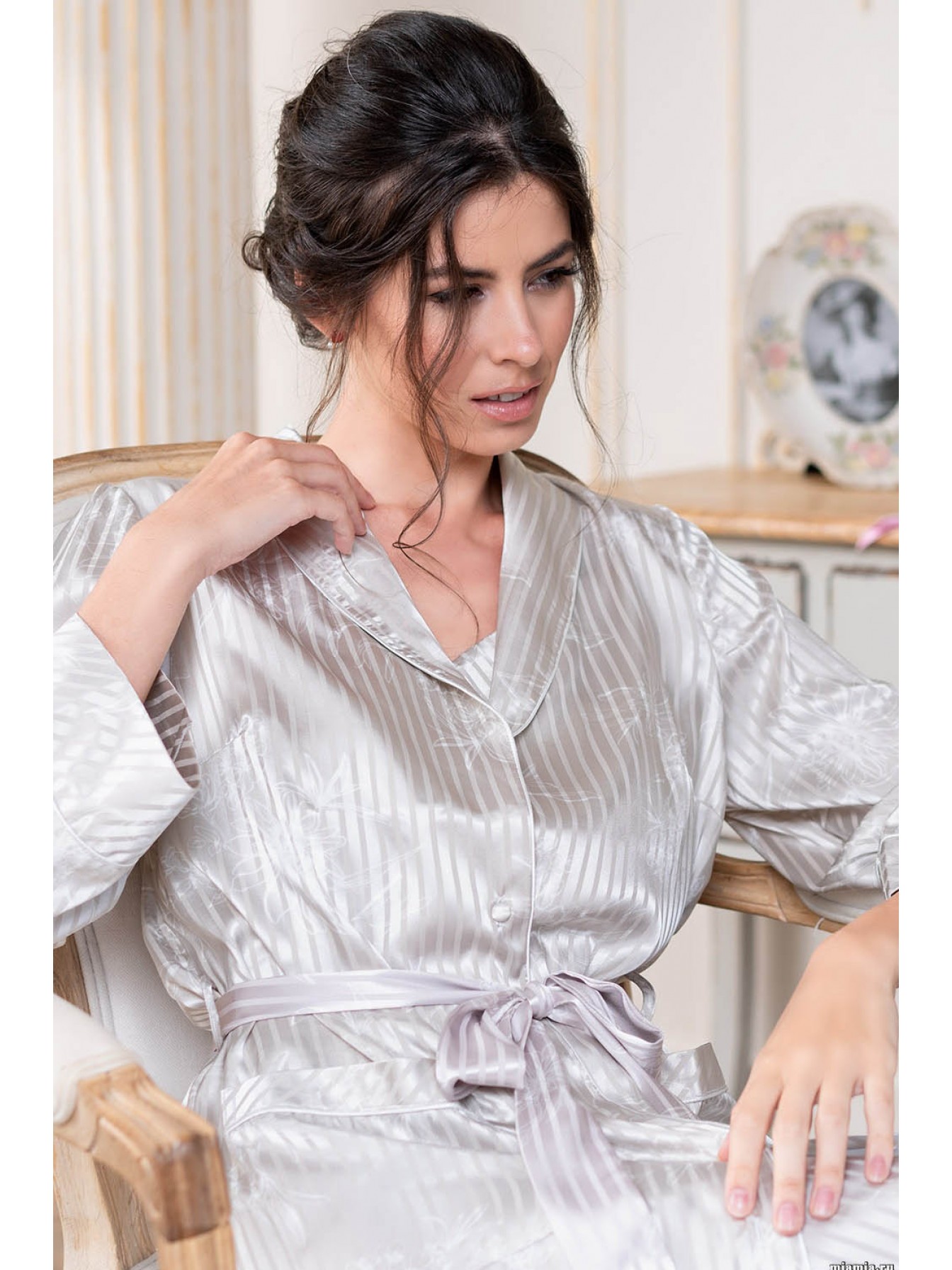 Длинный халат Josephine с центральной застежкой на пуговицы выполнен из искусственного принтованного жаккардового полотна. Перед халата декорирован парой кармашков на уровне бедер. Воротник, рукава и карман декорированы тонким кантом. По талии ширина халата регулируется поясом.