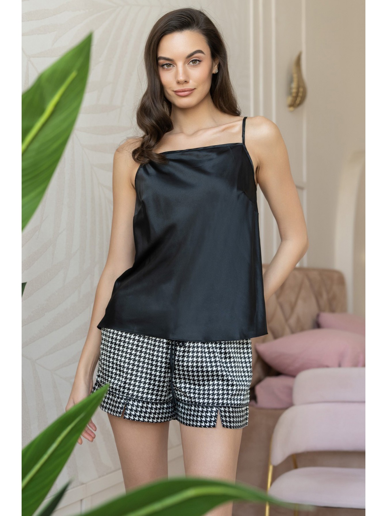 Комплект Mia-Amore состоит из топа на тонких бретелях и шорт. Топ выполнен из однотонного смесового шелка, а шорты из принтованного. В шортах используются два вида масштаба одного принта, разделенных контрастным кантом. По бокам расположены карманы. По низу шорт обработаны пикантные разрезы.