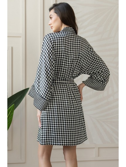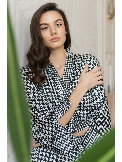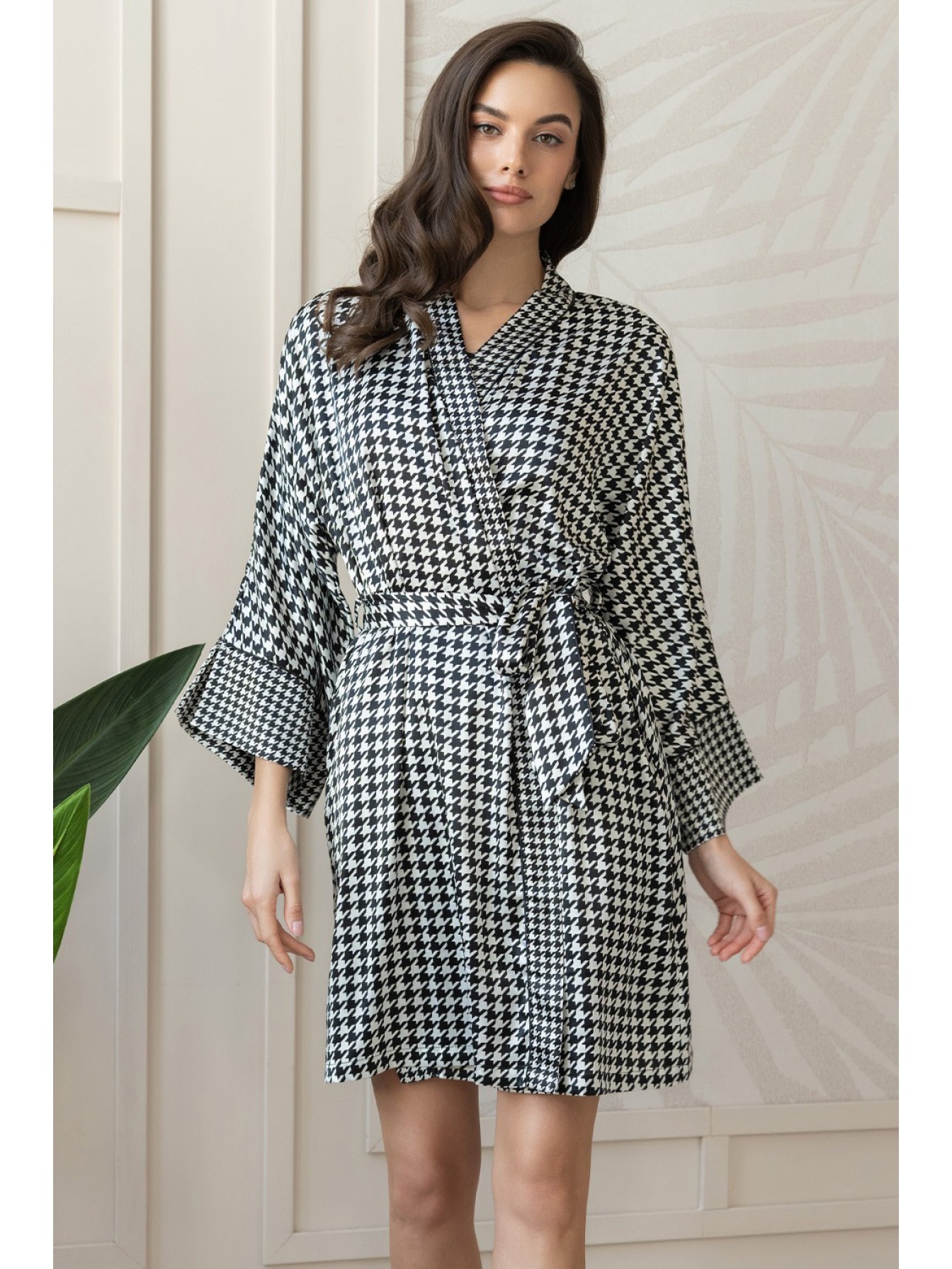 Короткий халат-кимоно Mia-Amore с широким рукавом длиной 3/4 . Халат выполнен из смесового шелка. В изделии используются два вида масштаба одного принта, граница которых разделена контрастным кантом. По бокам обработаны карманы.