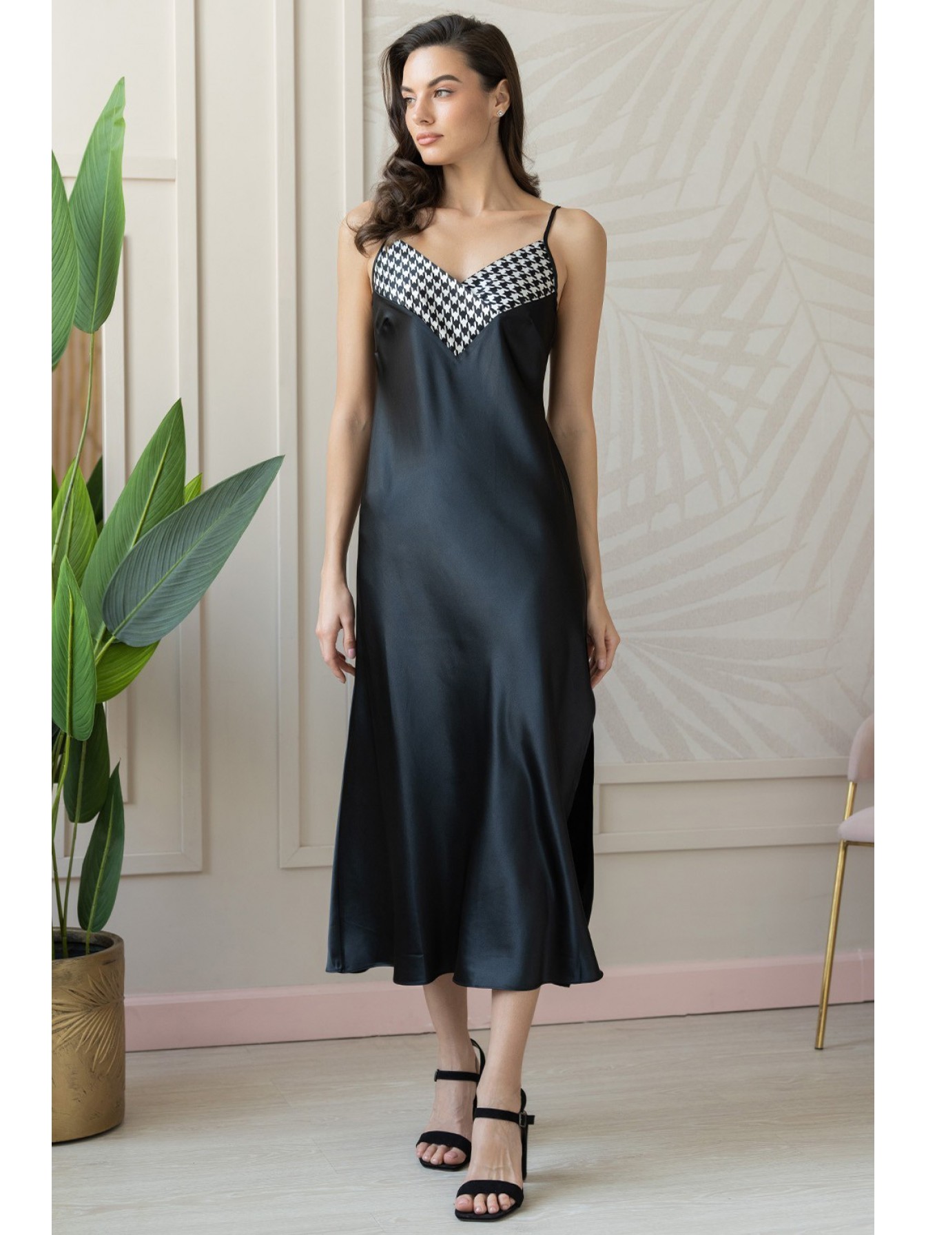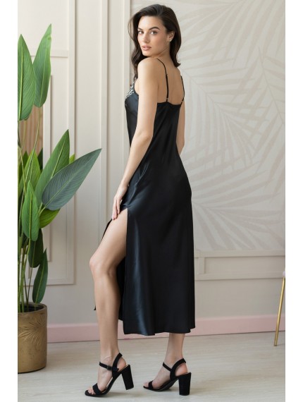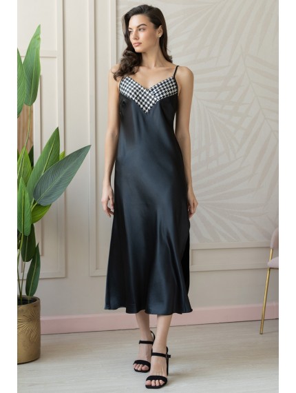 Длинная элегантная сорочка Mia-Amore полуприлегающего силуэта с высоким разрезом с боку, на тонких бретелях и без подреза под грудью, выполнена из однотонного смесового шелка с принтованной отделкой.