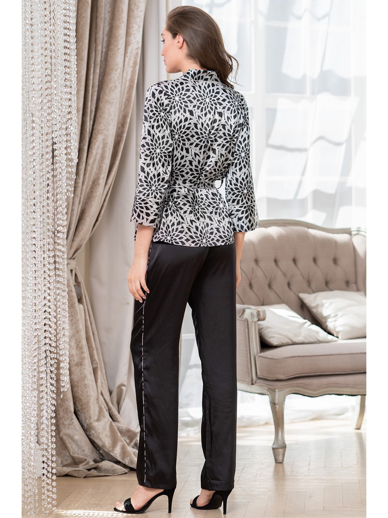 Комплект жакет с брюками Mia-Amore выполнен из принтованного искусственного шелка и черного атласа. Боковые швы черных брюк выполнены с отделкой из принтованного атласа. Жакет с застежкой на пуговицы и рукавами длиной 7/8. По борту, рукавам и карманам декорирован белым кантом. По талии прилегание жакета регулируется поясом.