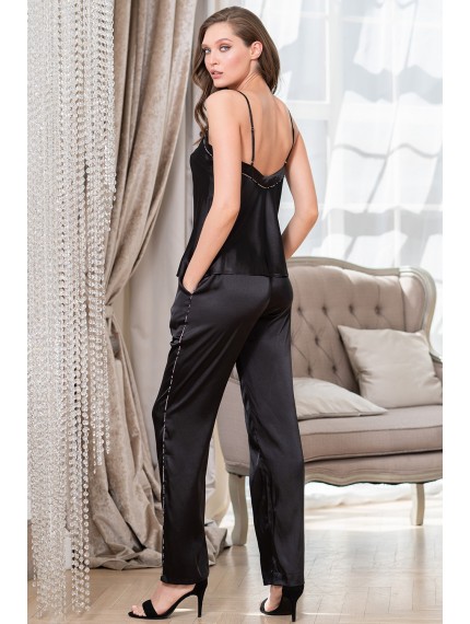 Комплект Mia-Amore состоит из запашного жакета, брюк и топа выполнен из принтованного искусственного шелка и черного атласа. Боковые швы черных брюк выполнены с отделкой из принтованного атласа. Простой черный топ комплектуется с жакетом, выполненном в виде кимоно. Низ и планка жакета, а также пояс эффектно выглядят из черного атласа.