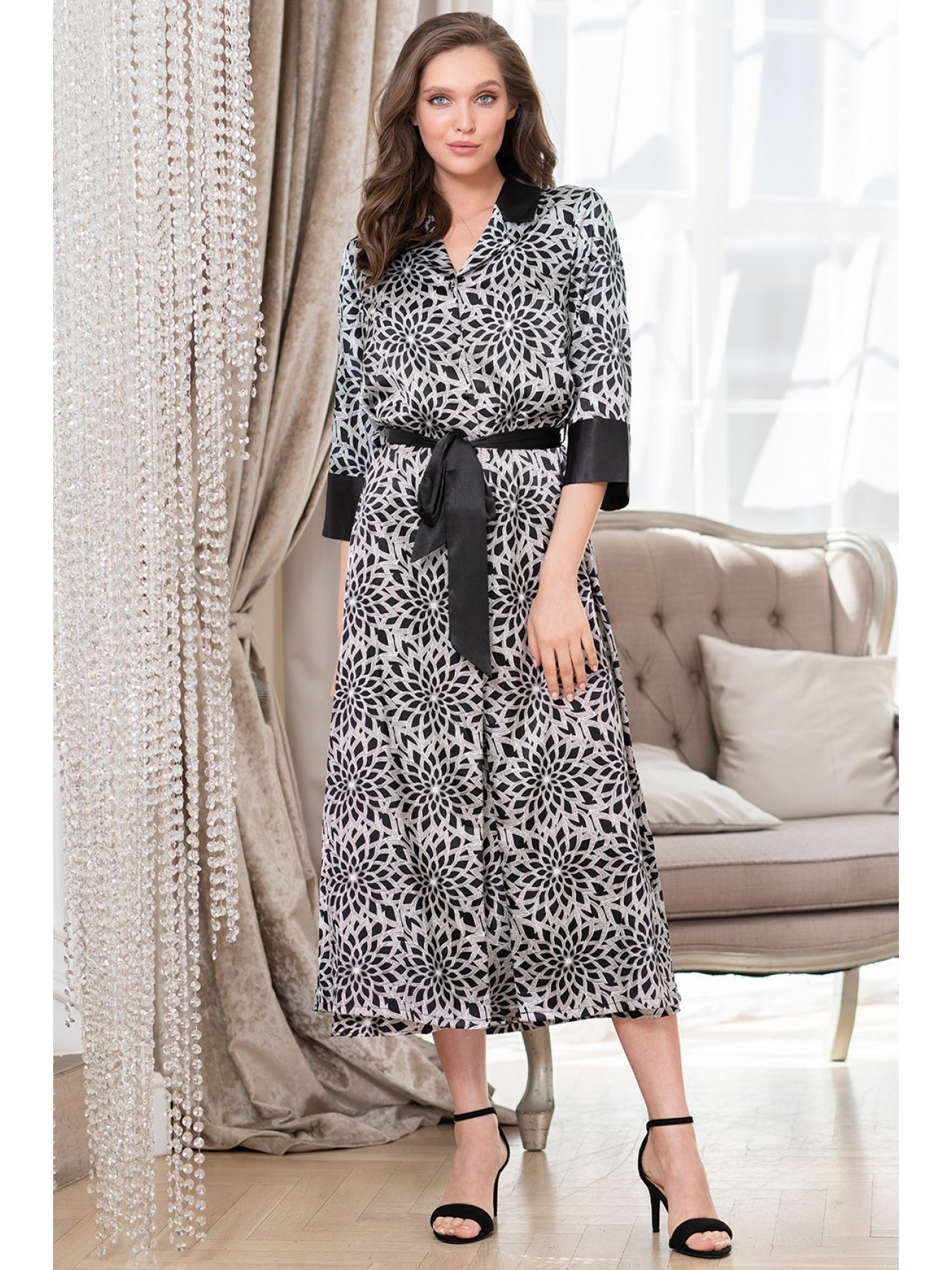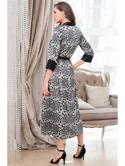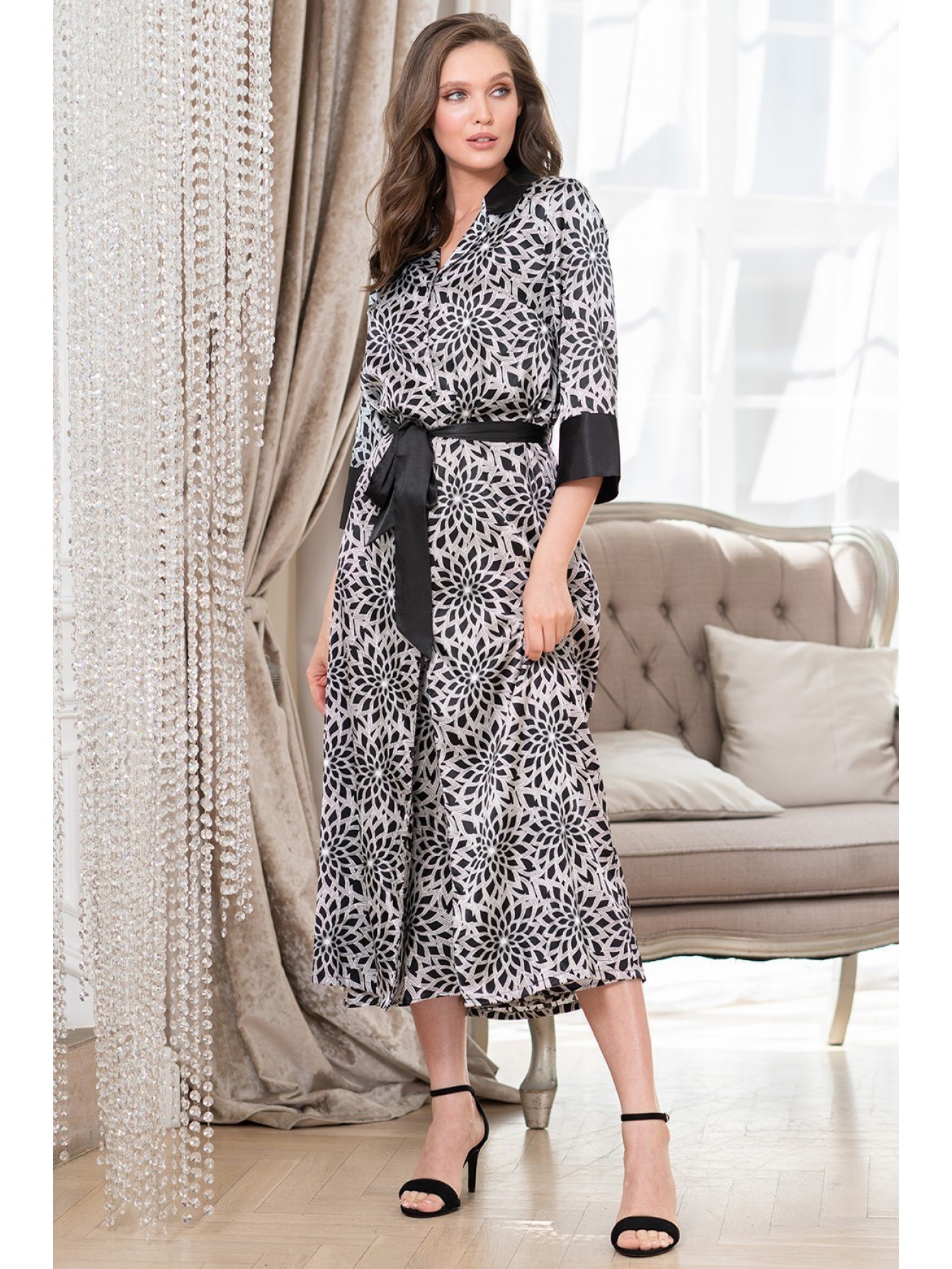 Длинный халат Mia-Amore с центральной застежкой выполнен из принтованного искусственного шелка. Воротник, низ рукавов и пояс выполнены из черного атласа, что подчеркивает элегантную линию коллекции. В боковых швах карманы.