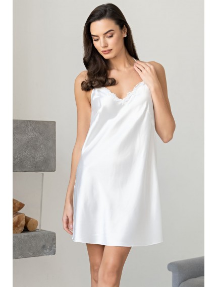 Короткая сорочка Mia-Amore без подреза на тонких регулируемых бретелях выполнена из однотонного смесового шёлка. Центр спинки украшает элемент из вышивного кружева. Верх лифа декорирован узким вышивным кружевом. По центру спереди расположен декоративный бантик с подвеской.