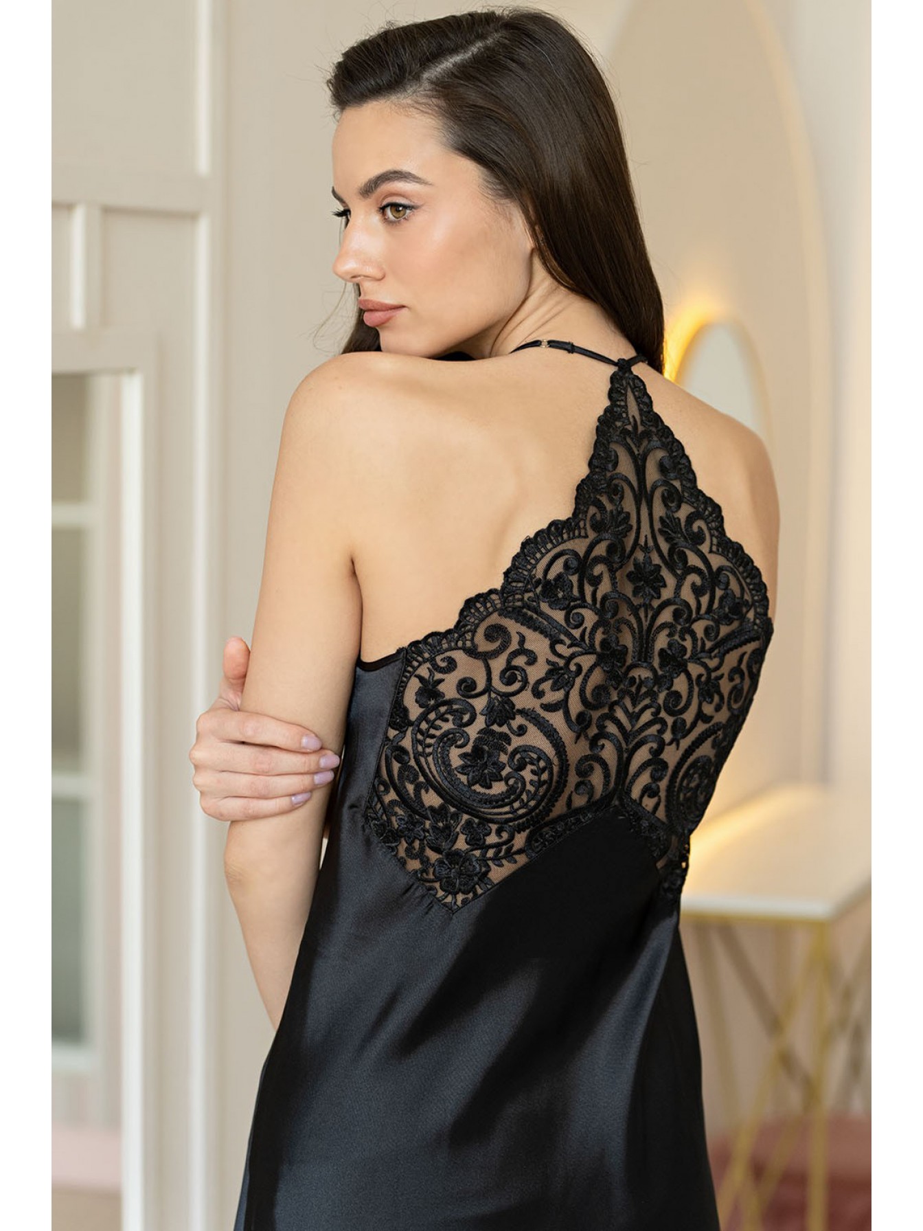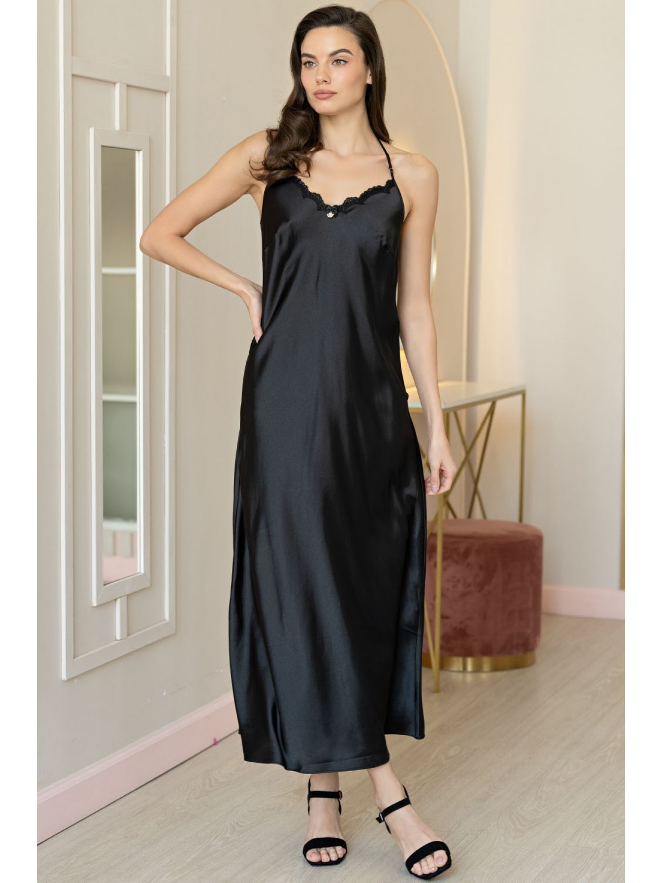 Длинная сорочка Mia-Amore без подреза на тонких регулируемых бретелях выполнена из однотонного смесового шёлка. Центр спинки украшает элемент из вышивного кружева. Верх лифа декорирован узким вышивным кружевом. По центру спереди расположен декоративный бантик с подвеской.