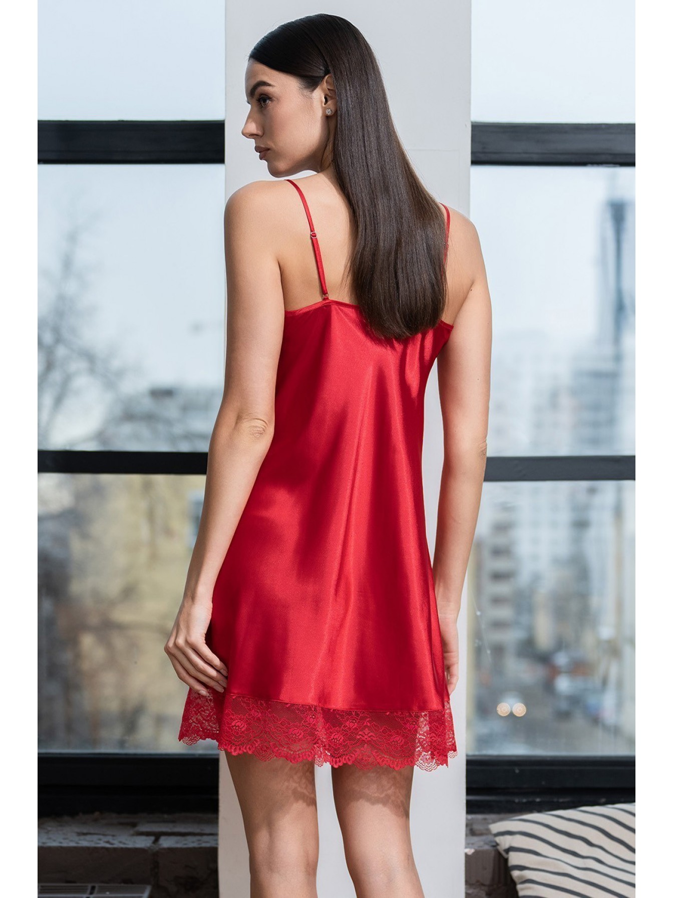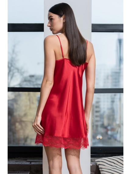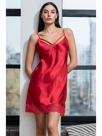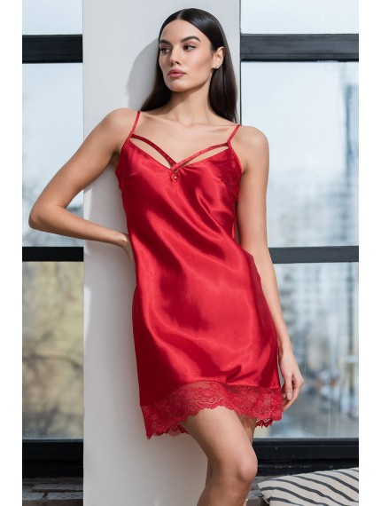 Короткая сорочка Mia-Amore на тонких бретелях без подреза под грудью с перекрещивающимися элементами по вырезу. Сорочка выполнена из искусственного шелка с блеском. Низ сорочки украшен ажурным кружевом. По центру выреза сорочки расположен атласный бантики с подвеской.