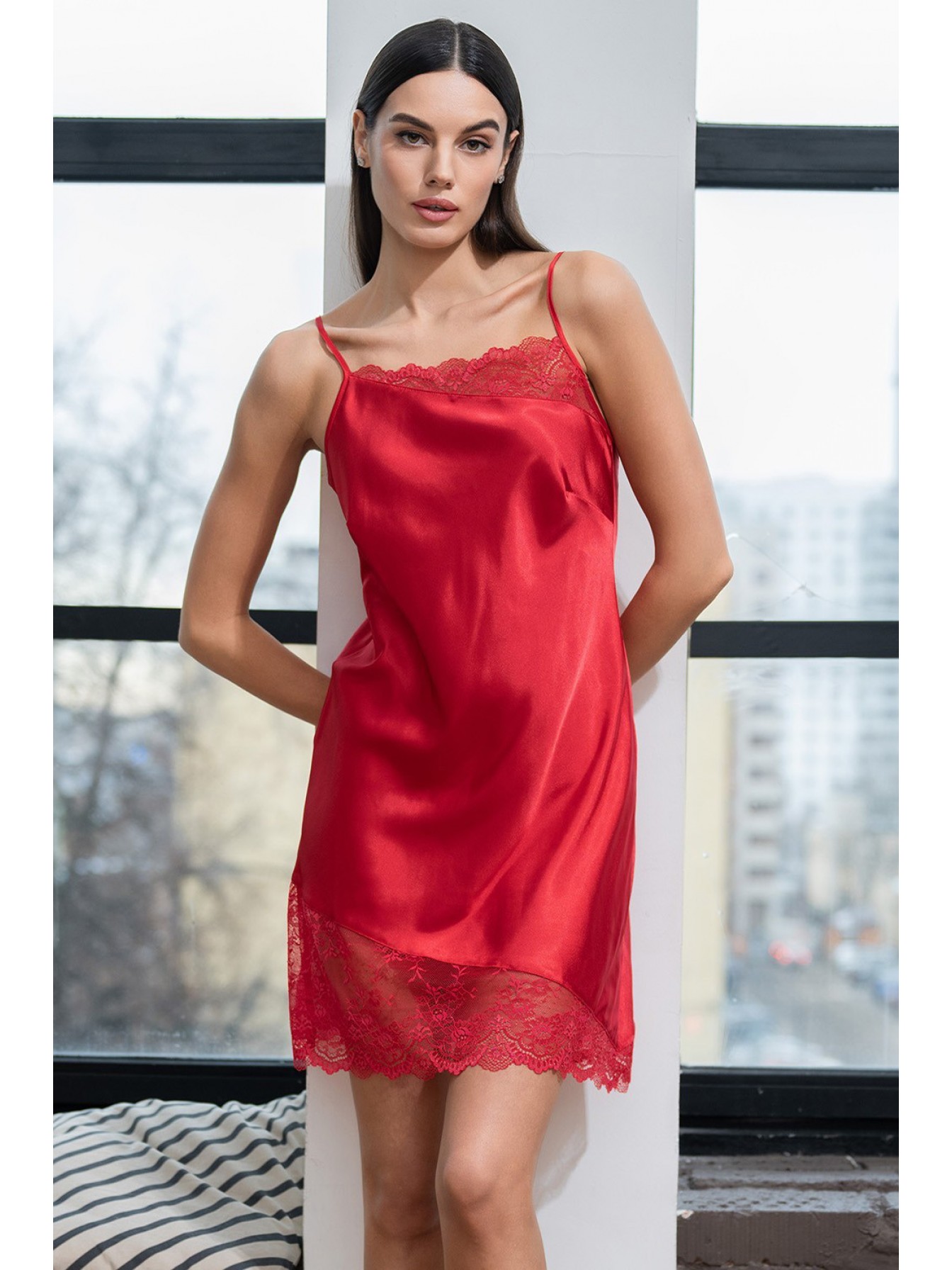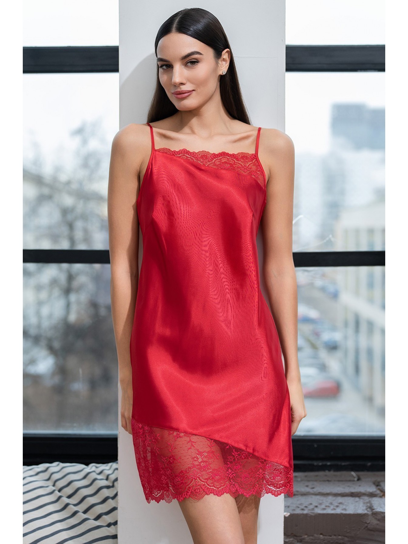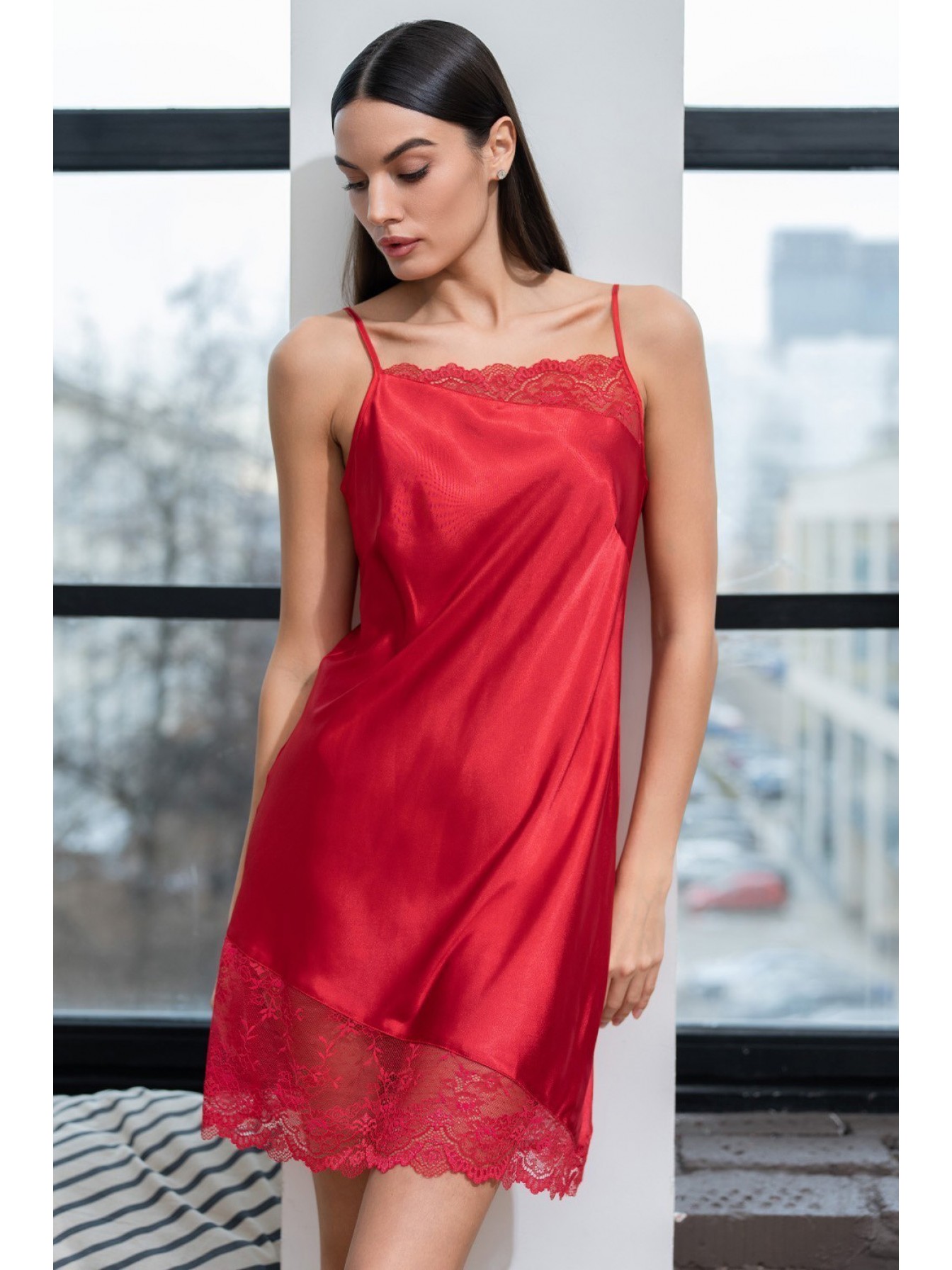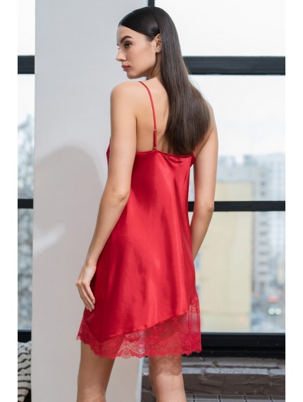 Короткая сорочка Mia-Amore на тонких бретелях без подреза под грудью, выполнена из искусственного шелка с блеском. Низ и верх сорочки украшены асимметричными вставками из кружева.