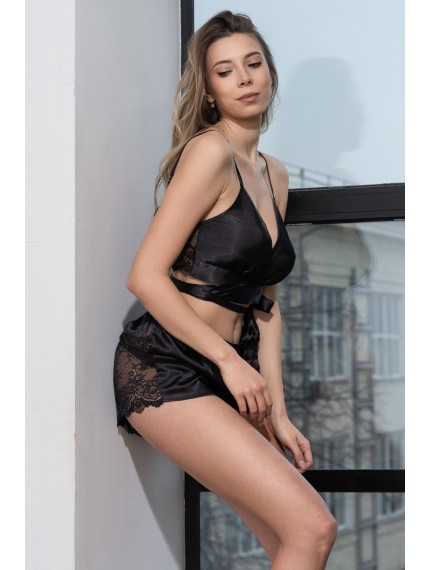 Сексуальный комплект Mia-Amore состоящий из запашного бралетта на тонких бретелях и шорт. Комплект выполнен из искусственного шелка с блеском и кружевными вставками.