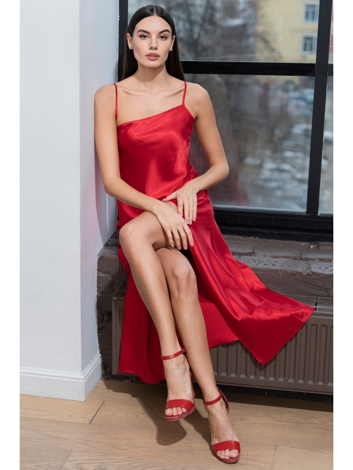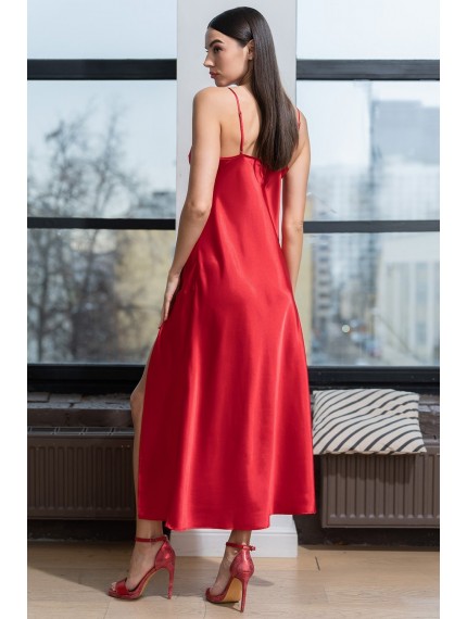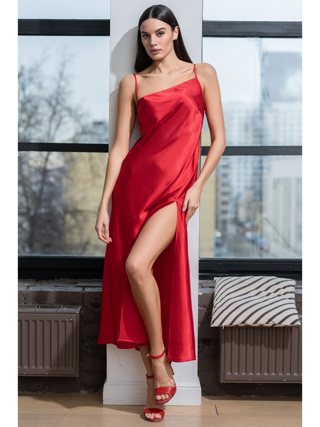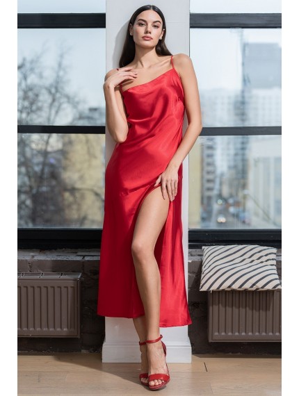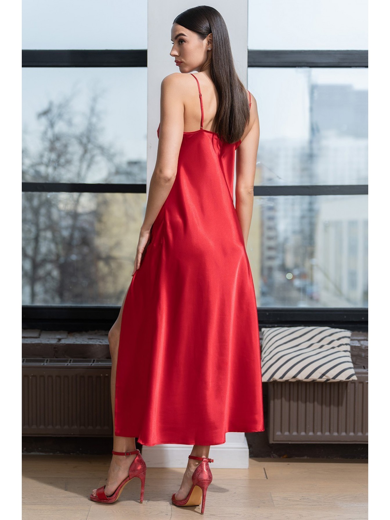 Длинная элегантная сорочка Mia-Amore с асимметричным вырезом на тонких бретелях, без подреза под грудью и пикантным разрезом. Сорочка выполнена из искусственного шелка с блеском.