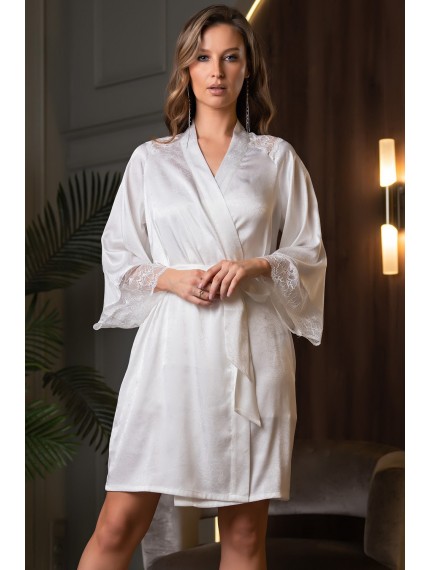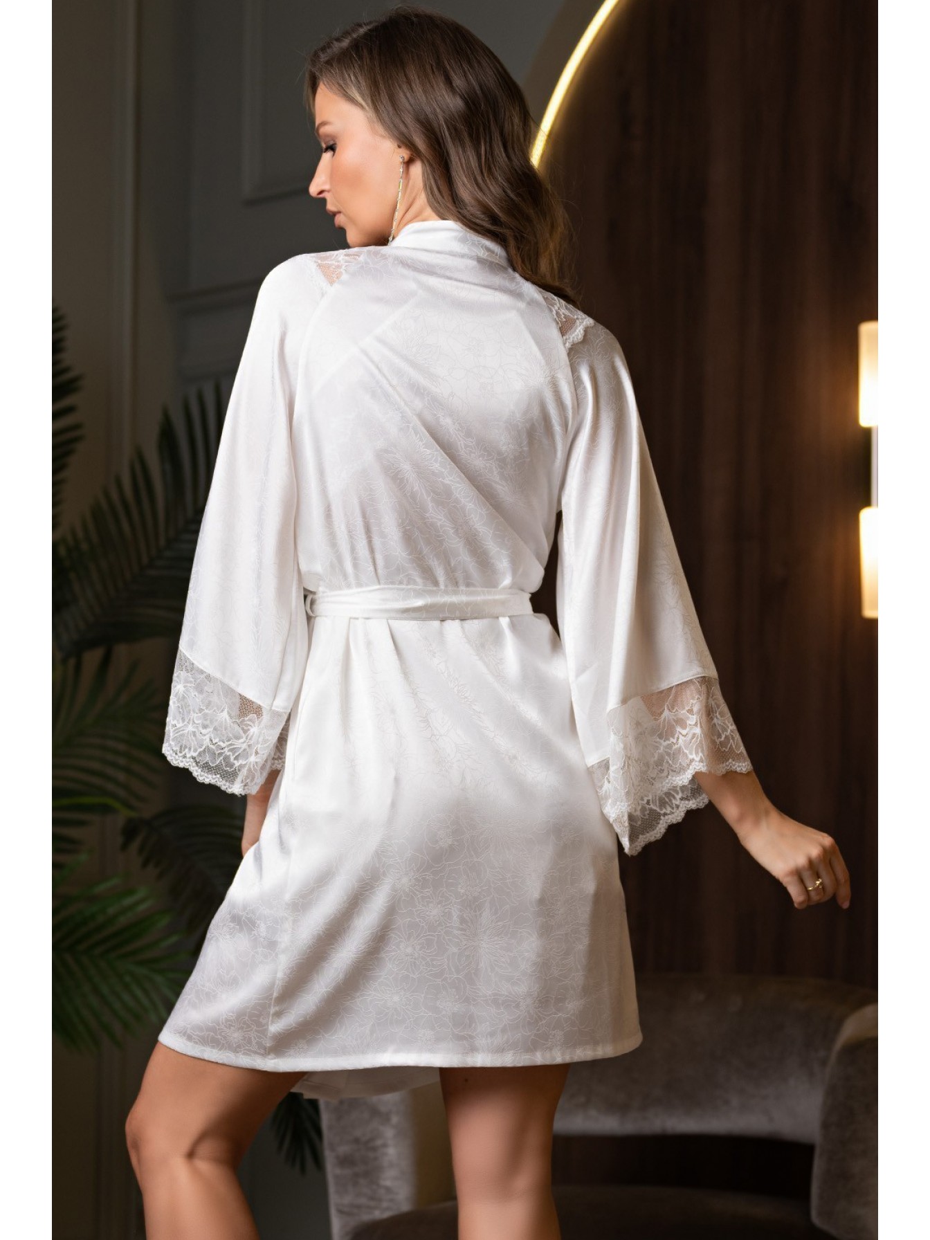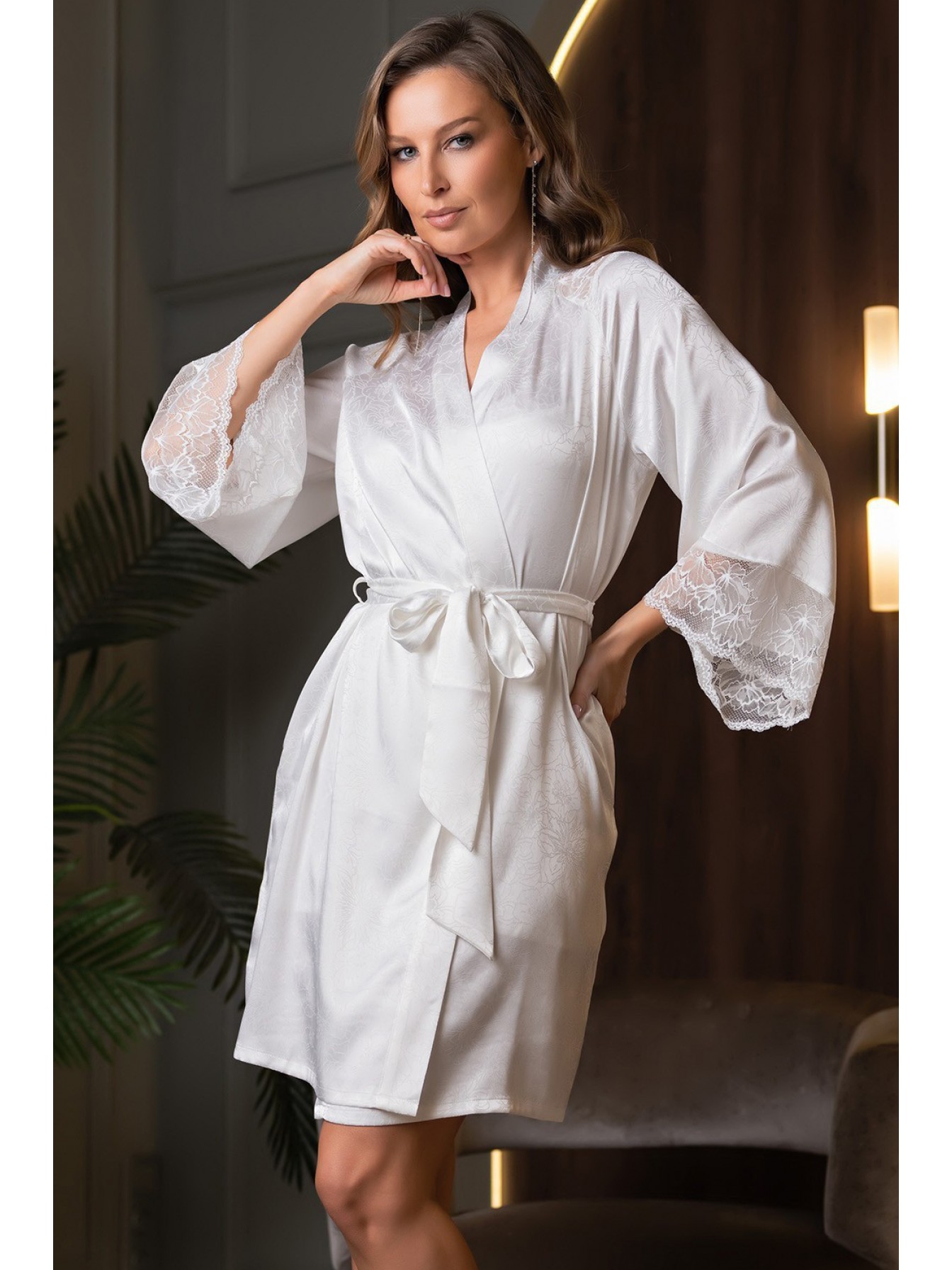 Элегантный короткий запашной халат Mia-Amore с длинными широкими рукавами, выполнен из однотонного искусственного шелка на жаккардовой основе и дополнен кружевными вставками, которые расположены по верху и низу рукавов. По бокам обработаны карманы.