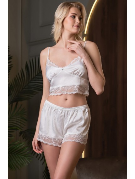 Нежный комплект-тройка Mia-Amore, который состоит из бралетта на тонких бретелях, шорт и запашного жакета с коротким рукавом. Комплект выполнен из однотонного искусственного шелка на жаккардовой основе и дополнен кружевными вставками. Декор - атласный бантик с подвеской, расположенный по центру выреза бралетта.