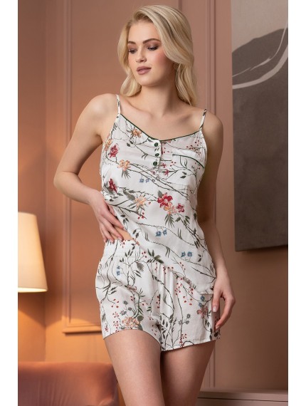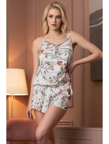 Комплект Mia-Amore состоит из топа на тонких бретелях и шорт. По центру топа обработана планка с застежкой на пуговицы. Шорты с широким эластичным поясом. Комплект выполнен из принтованного смесового шелка с отделкой в виде контрастного канта по вырезу полочки.